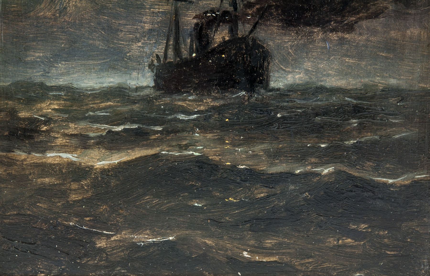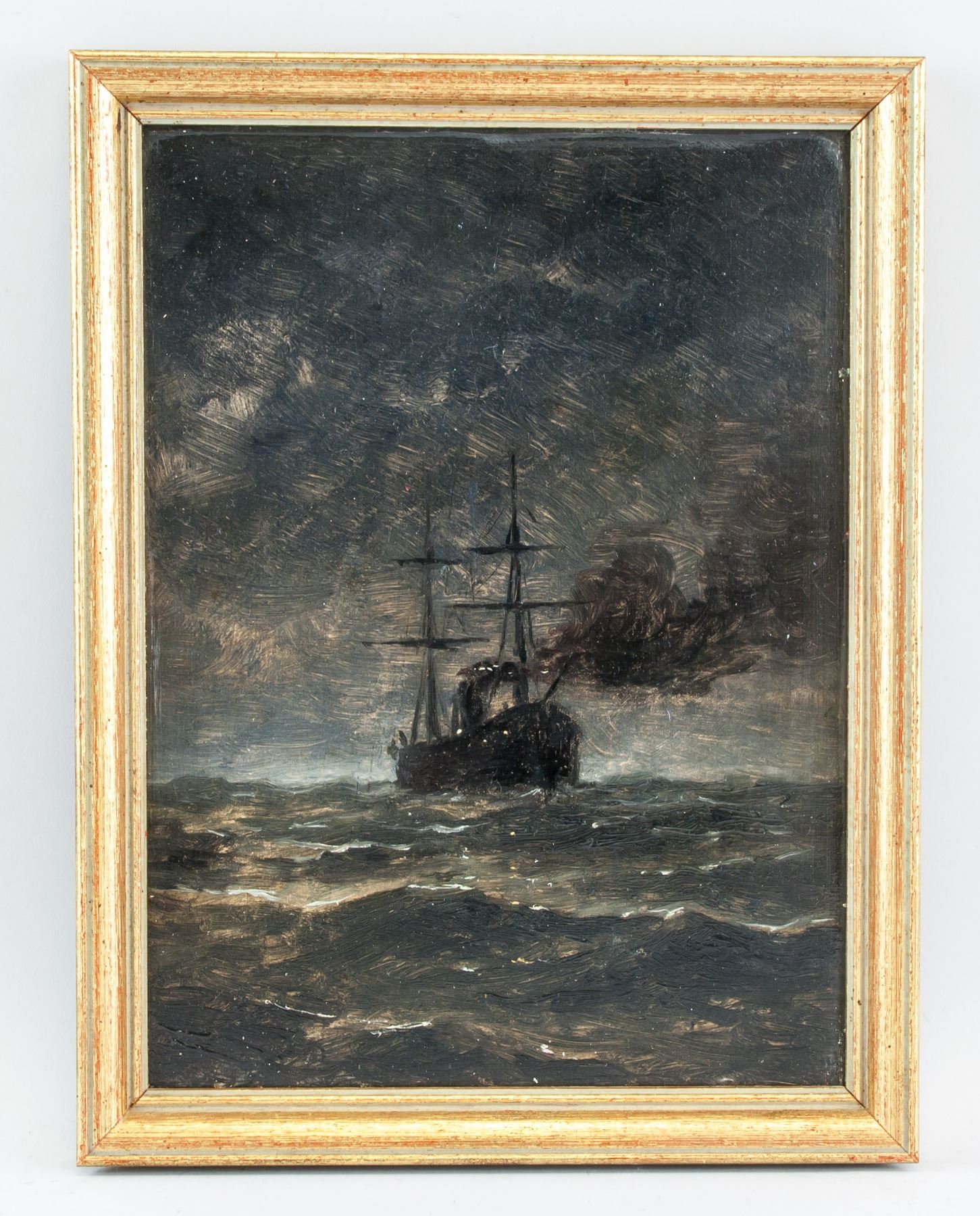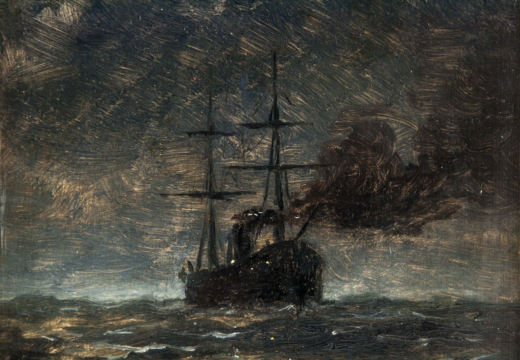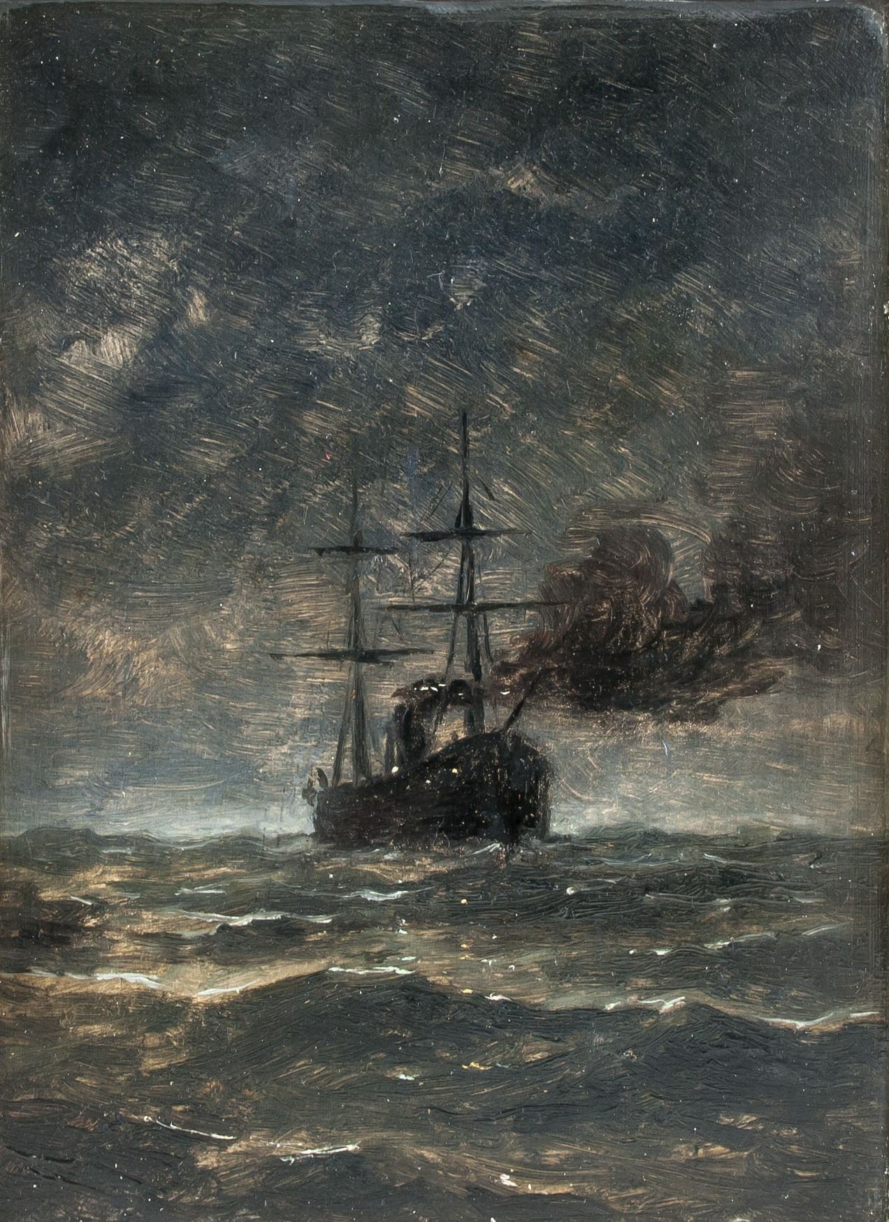 Oil on board. Featuring maritime storm scene. Attr. Gustave Courbet (French, 1819-1877). 12.2 x 8.9 in. (31 x 22.5 cm). Iconoclastic and influential Realist painter Gustave Courbet is often regarded as the 19th century’s pioneering artist. Courbet rejected academic traditionalism and bourgeois convention, seeking conflict both artistically and socially with an aim to, as he has said, "change the public's taste and way of seeing." Instead of idealizing his subjects like his Romanticist contemporaries, he dedicated himself to showing things as they are, bluntly addressing themes like rural poverty, as in The Stone Breakers (1849), and human sexuality; his erotically portrayed nudes were received with scandal and even police attention. Courbet also emphasized the painting process, visible brush and palette work displacing the customarily seamless varnished canvas. Younger artists including Édouard Manet and James McNeill Whistler, among many others, enthusiastically adopted these technical liberties. By exhibiting independently of the government-sponsored Paris Salon, Courbet paved the way for upcoming avant-garde movements, particularly Impressionism. PROVENANCE: Private collection (Toronto, ON)