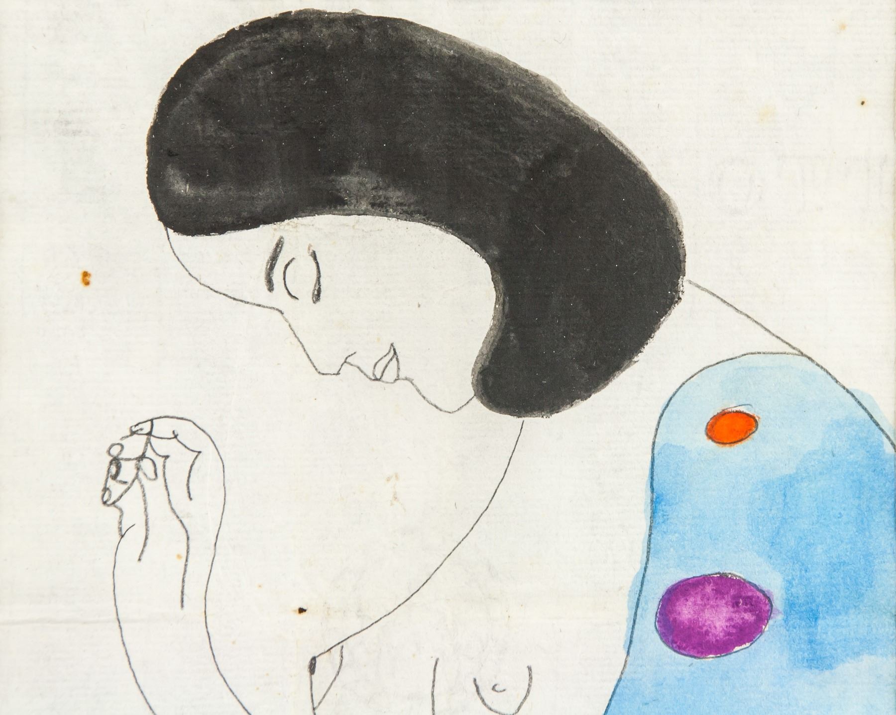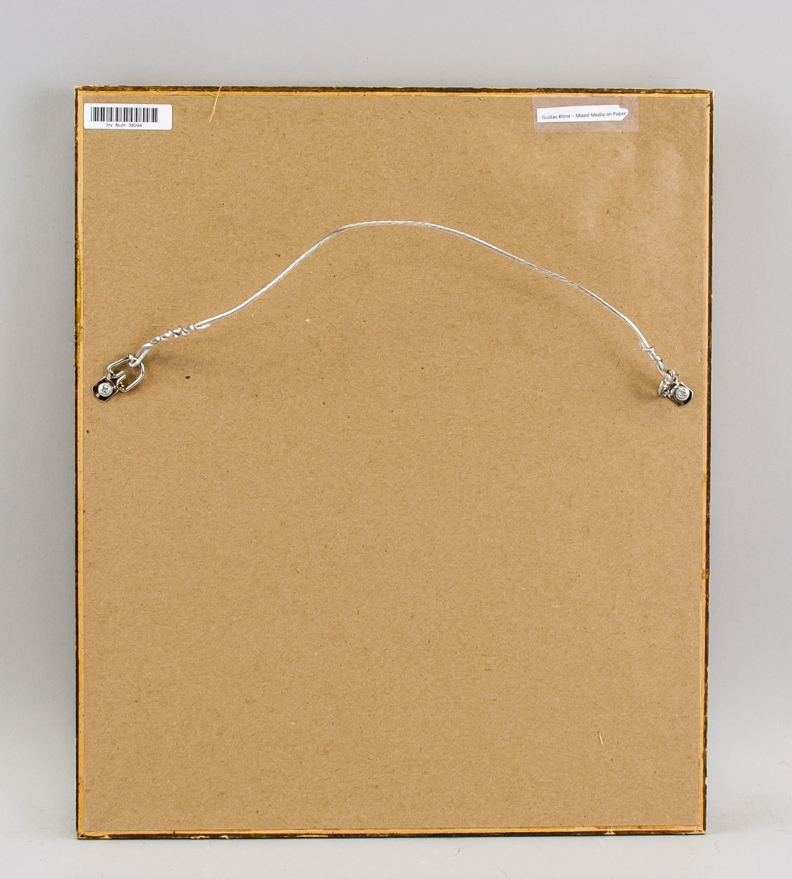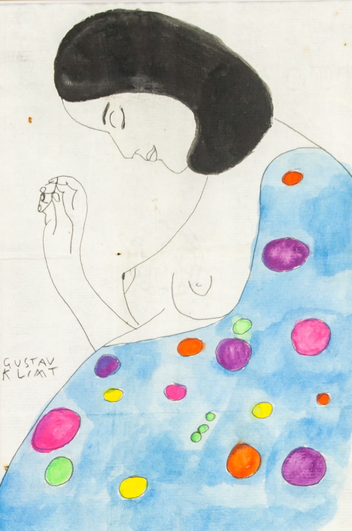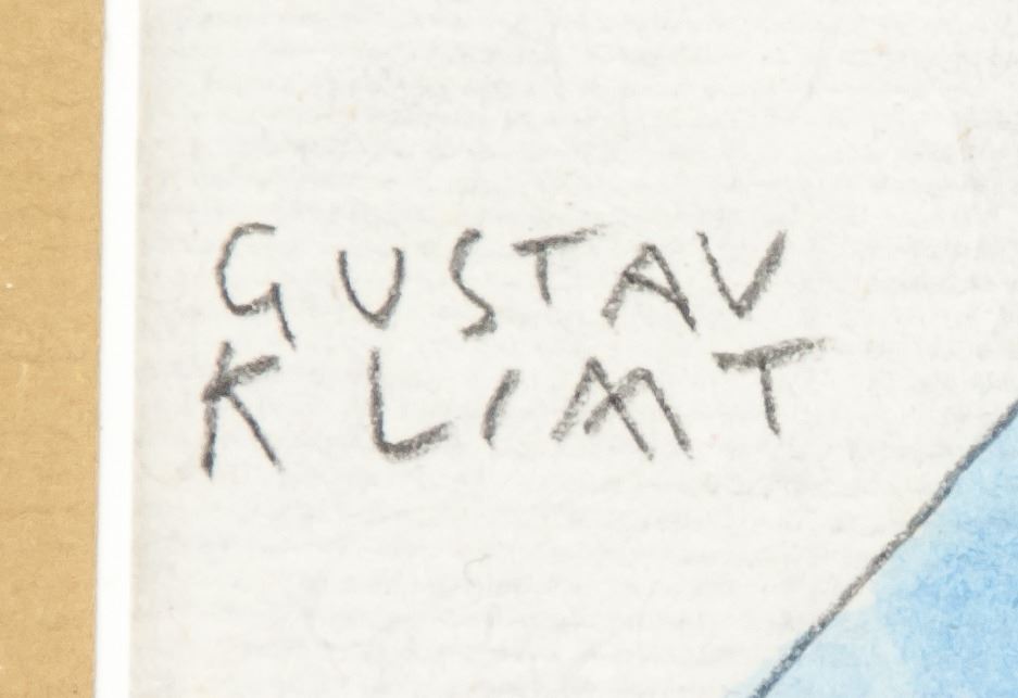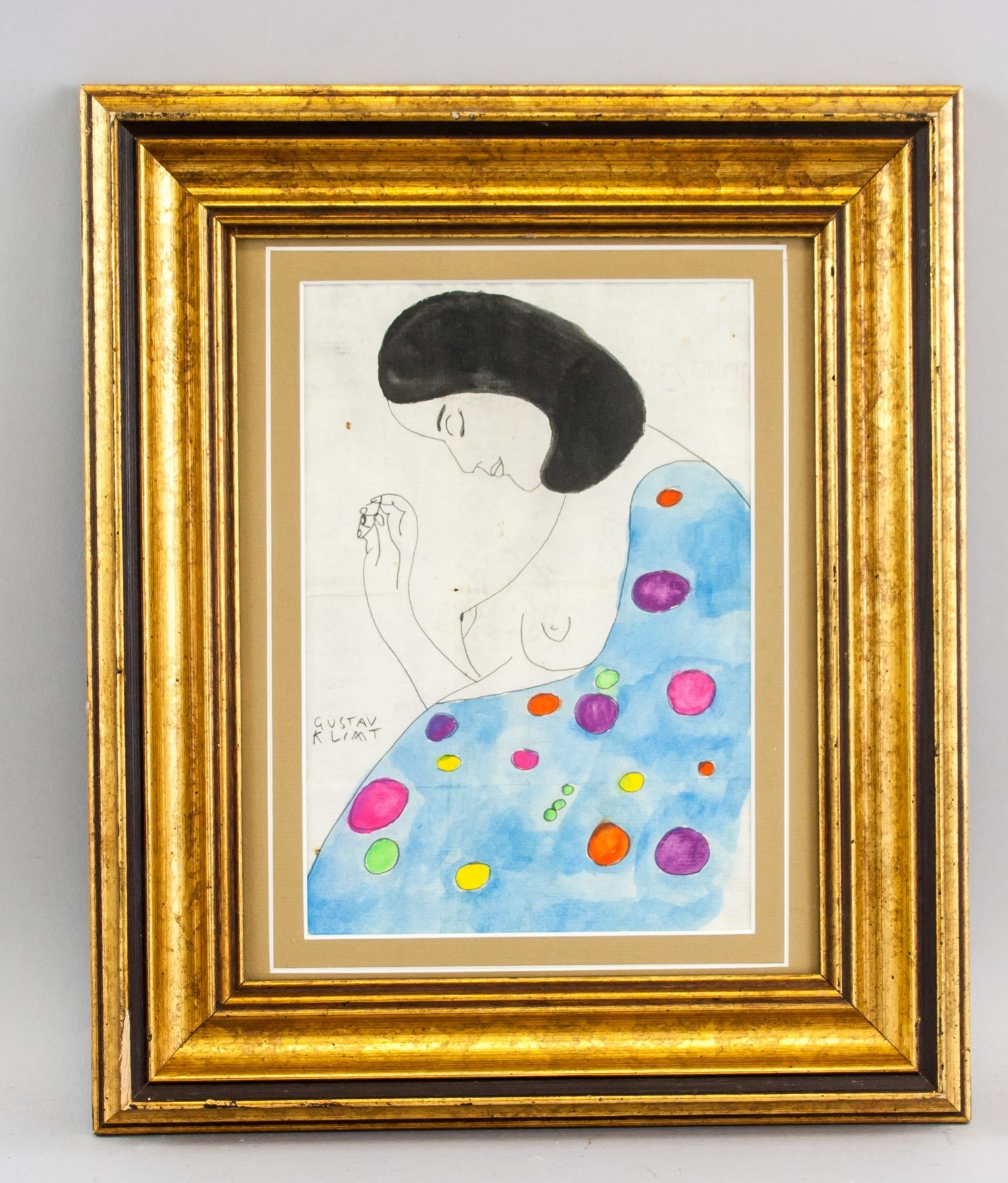 Mixed media on paper, framed. Featuring a portrait of a woman wrapped in a blanket. Signed and in the manner of Gustav Klimt (Austria, 1862-1918), signature on the left margin. 10.6 x 8.3 in. (27 x 21 cm). Gustav Klimt is best known for his opulently gilded art nouveau portraits of women that epitomize fin-de-siècle Vienna. His Symbolist pastiches of pale nudes, allegorical gardens and erotic content served as the basis for many American psychedelic poster designs in the 1960s. Early in his career, Klimt was supported generously by the Viennese community, and received several commissions for murals in theaters and the Museum Kunsthistorisches. Early narrative paintings depicted heavy subjects such as anxiety, doubt, sexuality, and death, but in later years, he turned toward landscape painting, exploring light and abstract patterns of nature. PROVENANCE: Southern Ontario estate