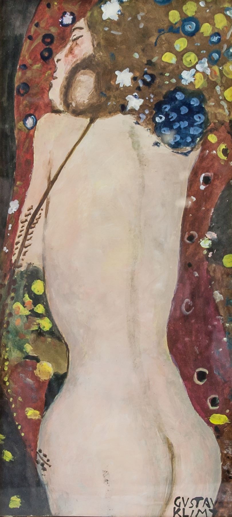 Gouache on paper. Featuring a nude. Signed and attr. Gustav Klimt (Austrian, 1862-1918) on the lower right corner. 28 x 13 cm (11 x 5.1 in.) Gustav Klimt is best known for his opulently gilded art nouveau portraits of women that epitomize fin-de-siecle Vienna. His Symbolist pastiches of pale nudes, allegorical gardens and erotic content served as the basis for many American psychedelic poster designs in the 1960s. Early in his career, Klimt was supported generously by the Viennese community, and received several commissions for murals in theaters and the Museum Kunsthistorisches. Early narrative paintings depicted heavy subjects such as anxiety, doubt, sexuality, and death, but in later years, he turned toward landscape painting, exploring light and abstract patterns of nature. His most famous paintings are The Kiss (1907) and Portrait of Adele Bloch-Bauer (1907), which sold for a record auction price of more than 100 million dollars in 2006. PROVENANCE: Southern Ontario estate