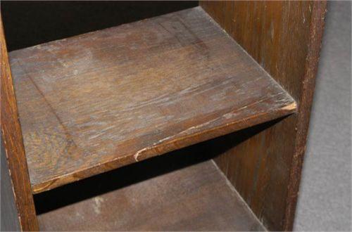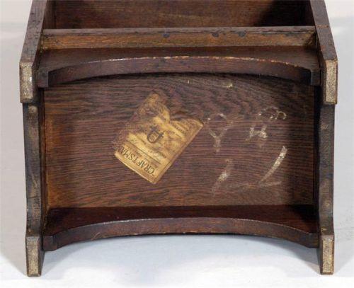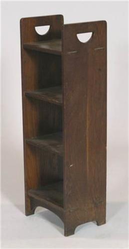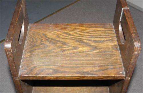 GUSTAV STICKLEY OAK MAGAZINE STAND original finish with label underneath, 40" high, ca. 1910, CONDITION: excellent original finish, second shelf has a sliver shaped piece 8" long by 1" that was broken off and neatly glued back at back of shelf. Light ring on top shelf.