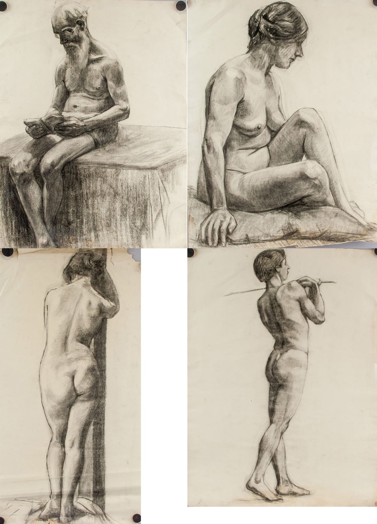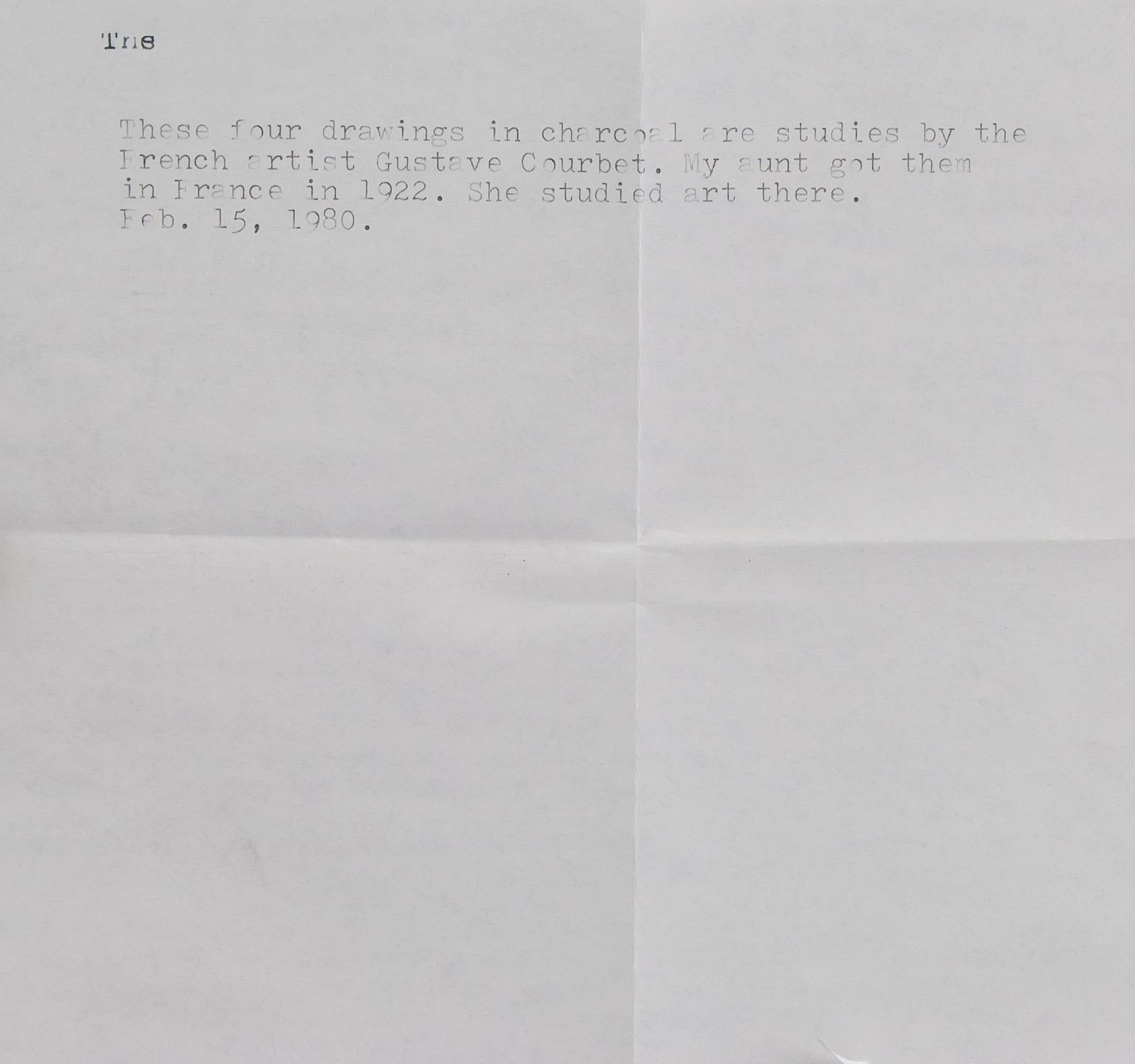 Charcoal on paper, featuring four still life drawings. Three are signed and attr. Gustave Courbet (French, 1819-1877), signed initials. Accompanied with a letter of provenance. Iconoclastic and influential Realist painter Gustave Courbet is often regarded as the 19th century’s pioneering artist. Courbet rejected academic traditionalism and bourgeois convention, seeking conflict both artistically and socially with an aim to, as he has said, "change the public's taste and way of seeing." Instead of idealizing his subjects like his Romanticist contemporaries, he dedicated himself to showing things as they are, bluntly addressing themes like rural poverty, as in The Stone Breakers (1849), and human sexuality; his erotically portrayed nudes were received with scandal and even police attention. PROVENANCE: Private Collection (Chicago, IL)