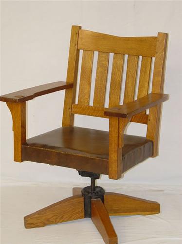 GUSTAVE STICKLEY MISSION OAK V-BACK SWIVEL OFFICE CHAIR-MARKED W/ RED COMPASS MARK (36" H X 26" W X 19" D) - OLDER REFINISH, WEAR & IMPERFECTIONS