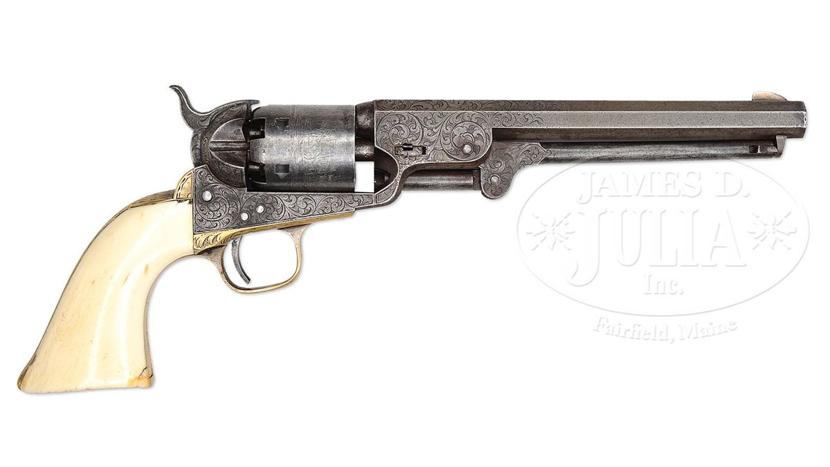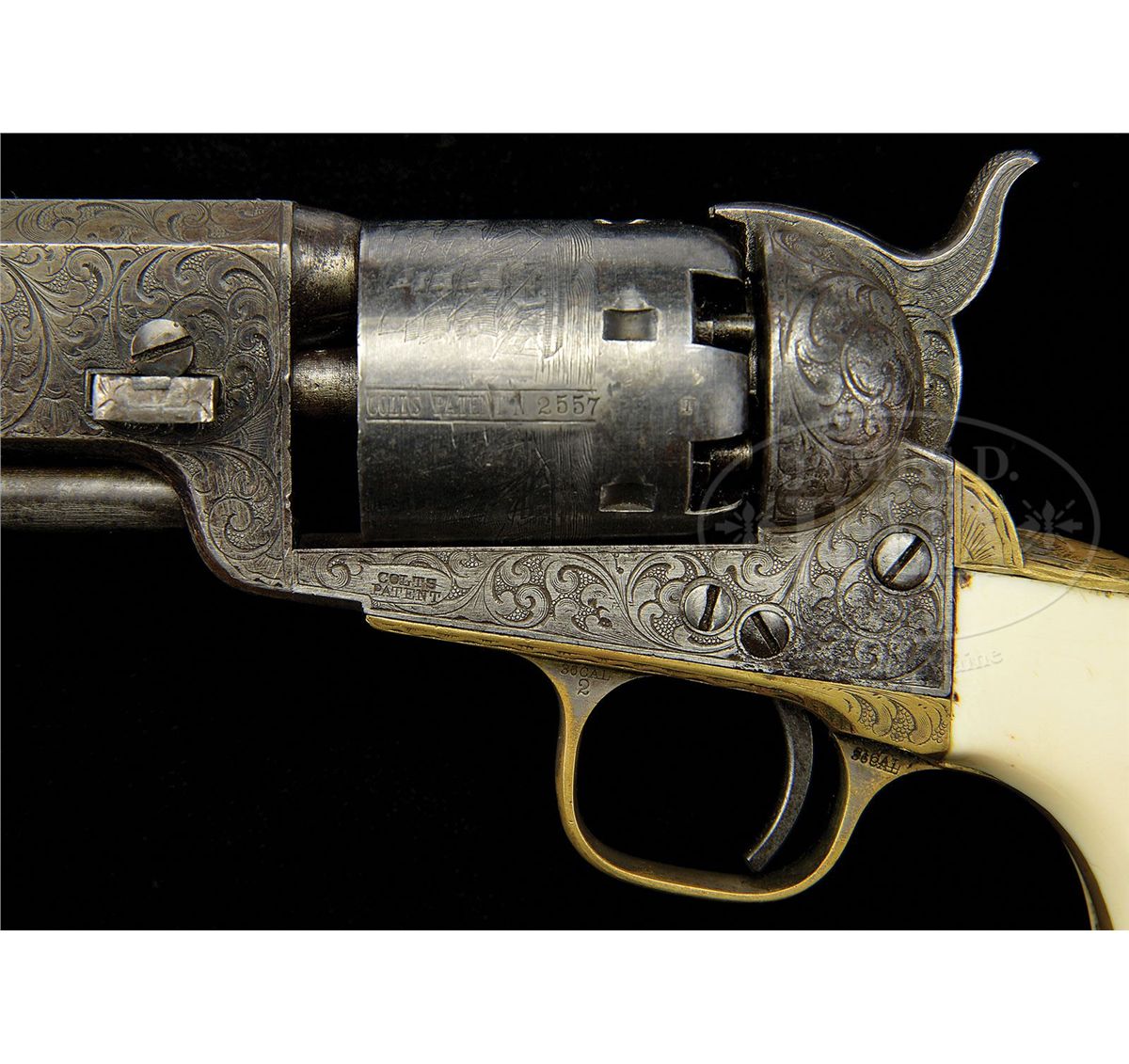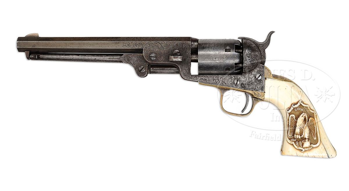 SN 142557. Cal. 36. Usual configuration with 7-1/2" oct bbl, rare German silver blade front sight that is probably a period of use replacement for the orig brass pin. Top flat has the 1-line New-York U.S. America address and left side of frame has a tiny "COLTS PATENT", with both left side, front & rear webs of trigger guard marked "36 CAL". The silver plated large 4th Model brass trigger guard & backstrap contain an orig style Colt 1-pc ivory grip with raised carved Mexican eagle in a raised scalloped frame on left side. Grip is made in the orig manner of two slabs of ivory attached to a central ivory spacer block. Cylinder is usual 6-shots with Ormsby Naval battle scene roll marking and all six safety pins crisp & serviceable. Frame is engraved by Gustave Young in full coverage foliate arabesque patterns on the frame with two scrolls on left side terminating in flower blossoms. Matching patterns extend over bbl lug and rammer pivot with two scrolls terminating in flower blossoms. Matching patterns extend over top side flats and the top flat has a dash & dot border pattern around the address. Backstrap has Mr. Young's style of foliate fan pattern at the top with foliate arabesque patterns at the top, on the heel, buttstrap & trigger bow. Hammer is engraved in his deluxe patterns of foliate arabesque scrolls on the shank, wolf's head on each side of the nose and fish scale patterns on sides & spur & top edge. These revolvers were Colt's answer to the demand for a smaller, lighter revolver for use as a holster pistol, especially on the frontier where they saw extensive and continuous service. They remained in service throughout the Civil War until about 1873 when they were supplanted by the advent of self-contained cartridge revolvers. Even after that they were still in use to some extent on the American Frontier, in Mexico & South America. Wild Bill Hickock and other notables of that era are documented as using the '51 Navy. This revolver was undoubtedly produced for a Mexican dignitary or military officer. CONDITION: Very good. No orig finish remains on the frame, bbl or rammer handle, being mostly a smooth gray/brown patina with some scattered fine pitting; cylinder retains an overall thin blue/gray patina and shows 80-85% Ormsby Naval battle scene roll marking. Grip has numerous fine age lines and retains a light ivory patina. Mechanics are fine, strong bore with moderate to heavy pitting. 4-48748 JR371