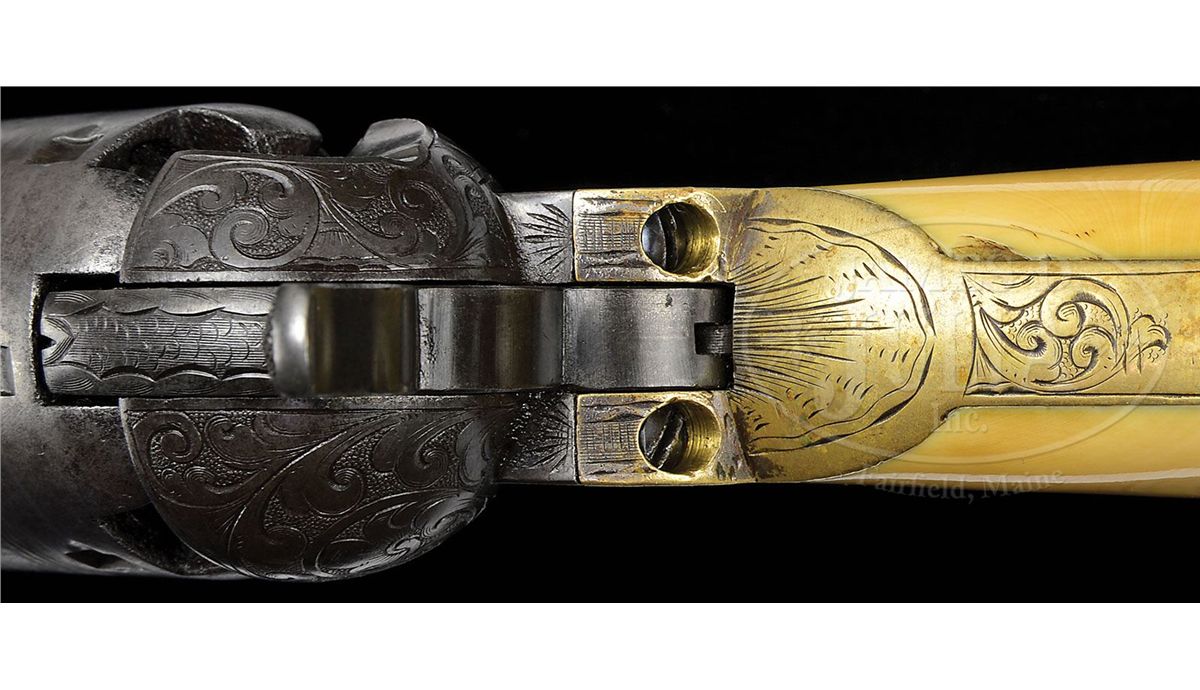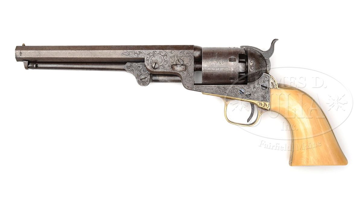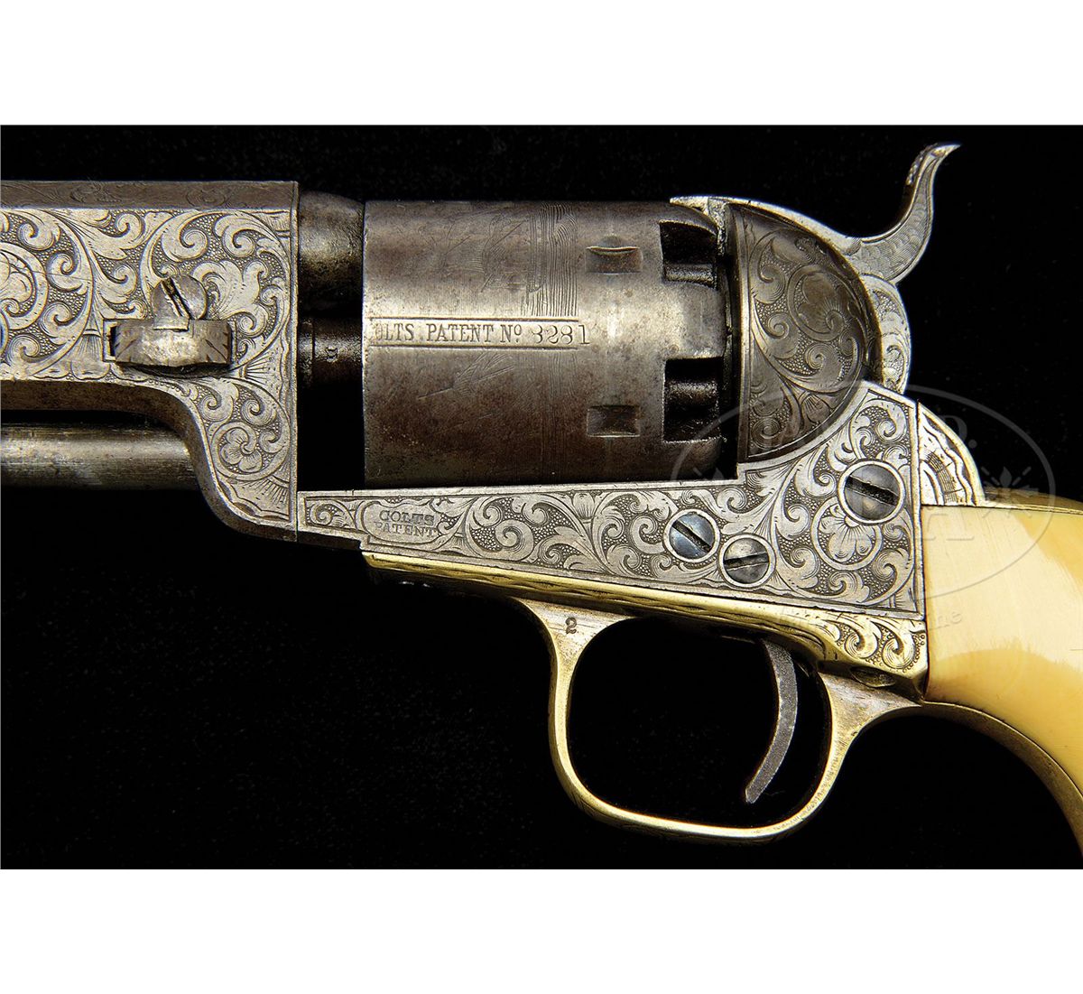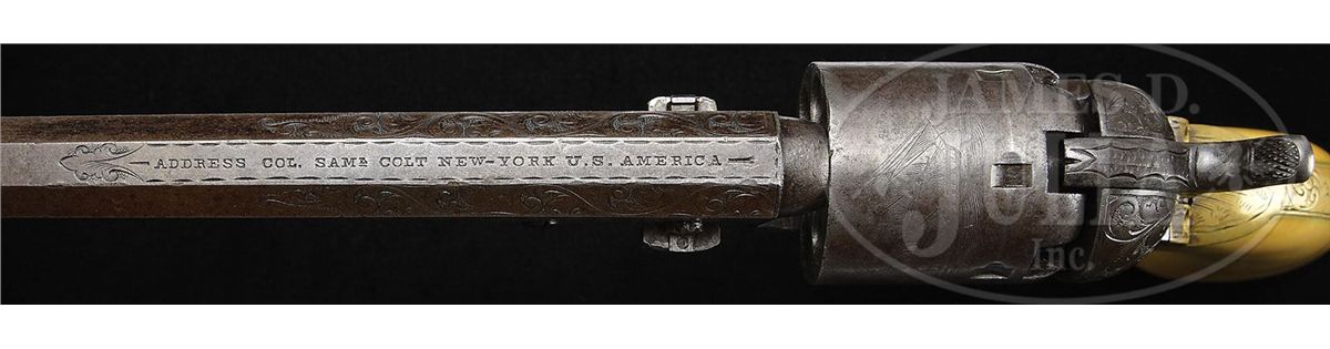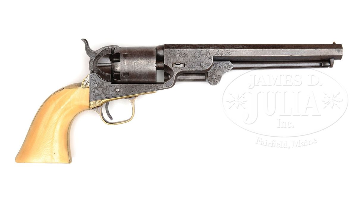 SN 128281. Cal. 36. Fine engraved '51 Navy with 7-1/2" oct bbl, brass pin front sight and 1-line New-York U.S. America address. Left side of frame has a small "COLTS PATENT" rolled mark. Cylinder is standard with Ormsby Naval battle scene roll marking. The 4th Model large guard silver plated trigger guard & backstrap contain its orig 1-pc smooth ivory grip with last four digits of matching SN in backstrap channel. Orig factory matching numbered 1-pc ivory grip is extremely rare with not very many known. Revolver is beautifully engraved by Gustave Young with full frame coverage foliate arabesque patterns with fine pearled background. Three scrolls on the frame terminate in flower blossoms. Matching patterns extend over the bbl lug, top side flats and rammer pivot. Four of those scrolls terminate in flower blossoms. Backstrap, buttstrap & trigger bow are engraved to match, with Mr. Young's foliate fan pattern at the top of backstrap. Hammer is also deluxe engraved with foliate arabesque patterns on shank, wolf's head on each side of the nose and fish scale patterns on the spur & top edge. All visible numbers are matching and the numbers on the frame, bbl lug & buttstrap are accompanied by a small "I" which indicates ivory grip. CONDITION: Very good to fine. Bbl retains 20-25% thin orig blue in sheltered areas and on the right side with the balance a medium blue/brown patina; rammer pivot & handle retain dark case colors; frame & hammer also retain dark case colors with fine pitting around the hammer nose; cylinder is a thin silver/brown patina and shows 60-70% Ormsby Naval battle scene; trigger guard & backstrap retain thin silver in sheltered areas being mostly a medium mustard patina. Grip is extremely fine plus showing very little wear with much orig polish and retains a beautiful golden ivory patina. Mechanics are fine, strong bore with good shine and a few scattered spots of pitting. 4-48815 JR378