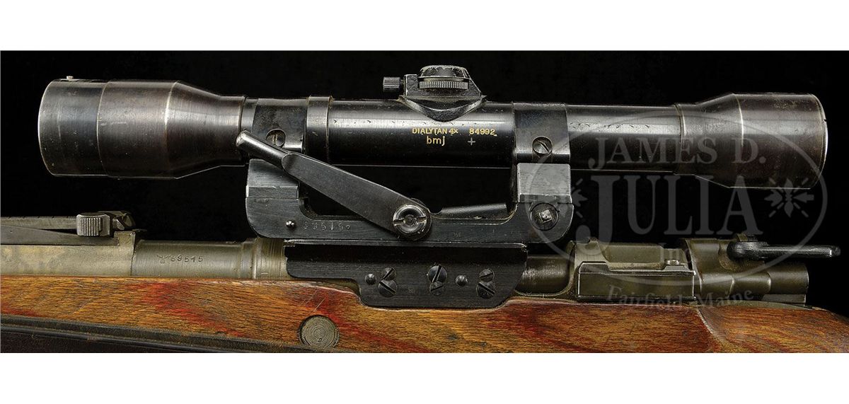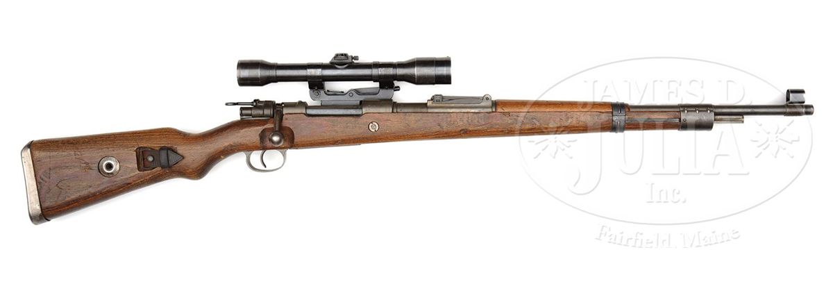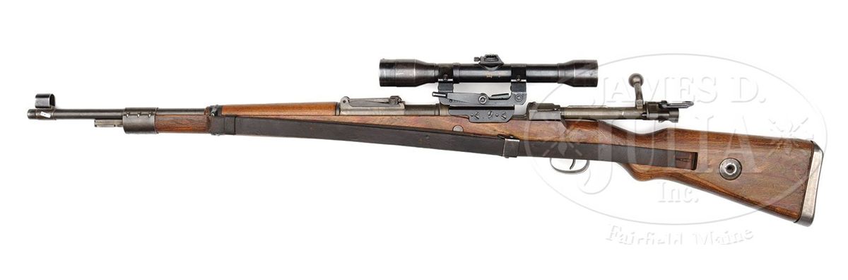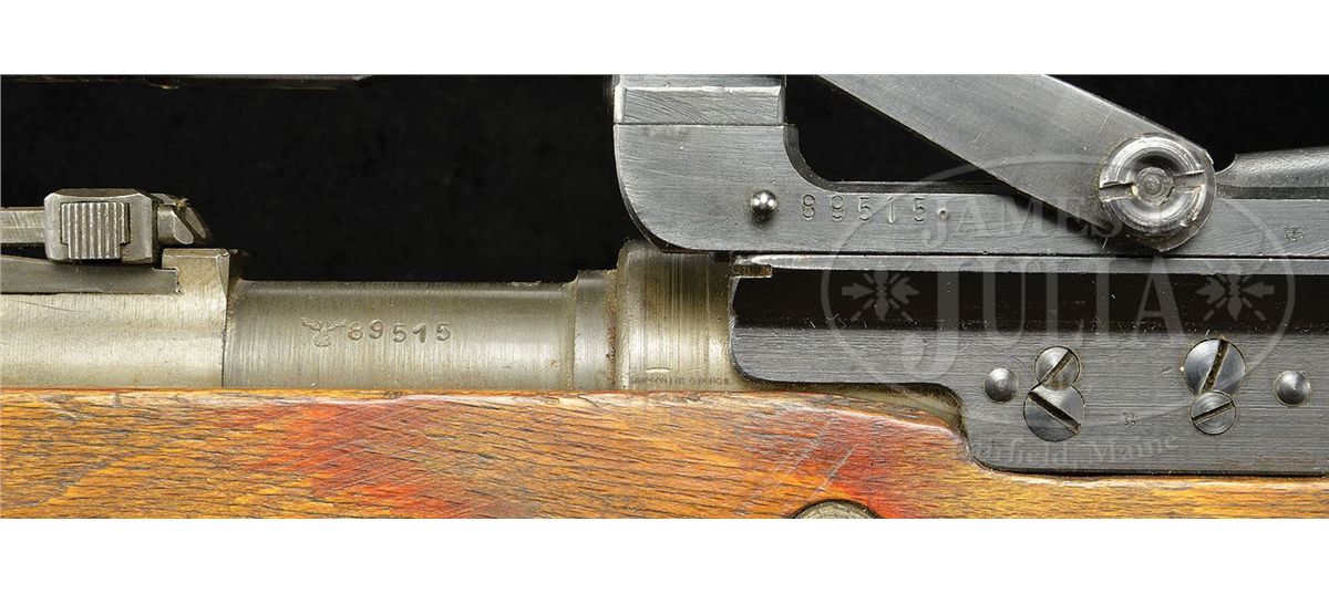 SN 89515. Cal. 8mm. Very fine authentic late WWII Gustloff produced long siderail K98k sniper rifle. Factory thick-walled phosphate receiver top, marked WaA 749, and "bcd 4", representing Gustloff-Werke, Weimar production, 1944. All weapon SN's match rifle SN 89515, with the exception of unmarked front and rear bands, "d" marked trigger guard and "qnw" magazine floorplate. Authentic, blued long siderail mount marked WaA 359 with six correct screws and two correct index pins. Left bbl marked with Nazi era firing proof and 5-digit SN. "Dialytan" four-power scope is marked "bmj+", SN 84992, correct three-post reticle, and includes orig period leather scope cover marked WaA 414. Authentic mount is serial numbered to the rifle "89515". and marked WaA 359. Red glue laminate stock is marked Eagle/H and single "c" on the bottom. Comes with authentic serviceable "L&F" marked leather sling. Overall correct and fine example of German Army late long siderail sniper rifle with pleasing late war mix of blue and phosphate parts. PROVENANCE: Collection of Dr. Geoffrey Sturgess. CONDITION: Very good to excellent. Scope is very good, optics are slightly hazy. Bore is very good to excellent. Stock is very good with scattered handling marks and scratches. 4-53268 DW31