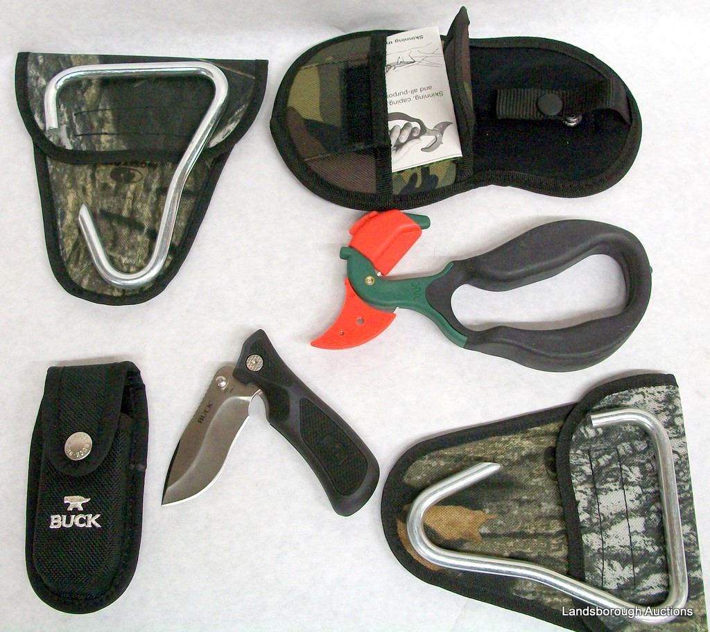 BUTT OUT TOOL, CAVITY SPREADERS, SKINNING KNIFE, MEAT HOOKS AND BUCK 595 KNIFE. NEW.