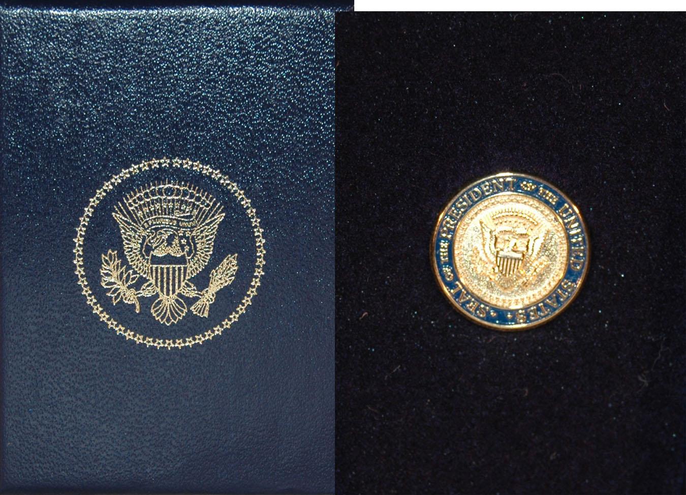 Exclusive George W. Bush diecast pin. Navy pin features gold gilt around the edges and the Presidential seal in the center. Bush's facsimile signature appears to the verso. Housed in a VIP box featuring the presidential seal. Pin measures 0.5'' in diameter. Overall mint condition.