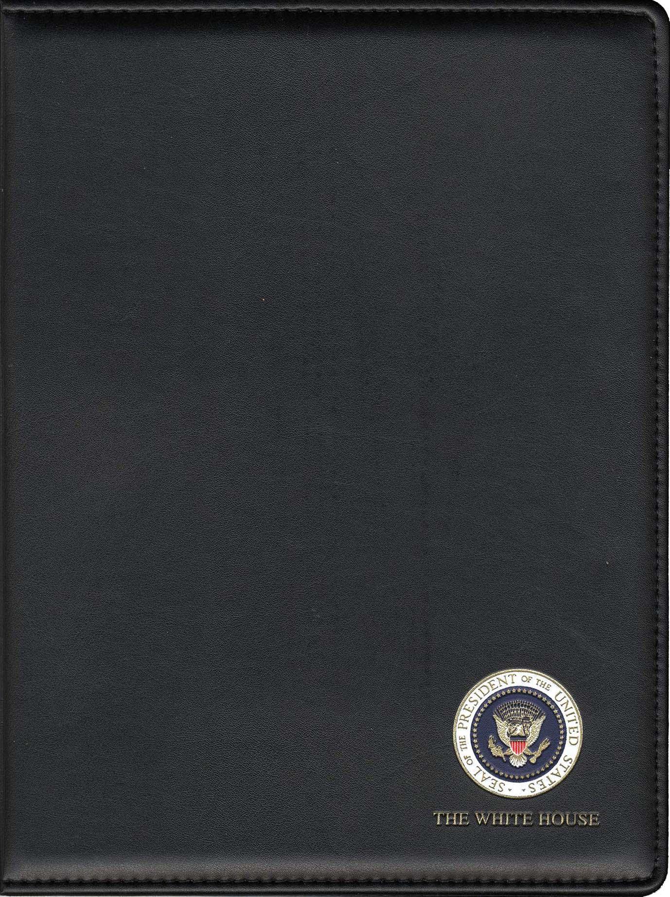 George W. Bush Presidential White House portfolio with space for internal writing pad. Part of a five piece Presidential desk set. Faux leather with design used by the current administration. Excellent contemporary Presidential item.