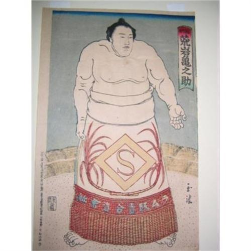 WOODBLOCKS OF WRESTLERS ARE ALWAYS COLLECTABLE . ON THE FRONT OF HIS WRAP IS THE NAME OF THE WRESTLER. IT IS IN A FORM OF A INSIGNIA, THIS PIECE IS FROM THE MEIJI PERIOD AND IS WONDERFUL CONDITION, FULL BORDERS AND COLORS ARE RICH