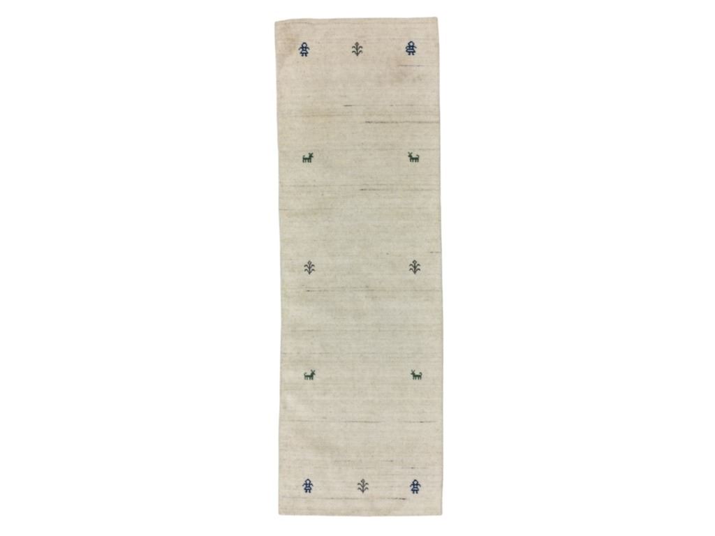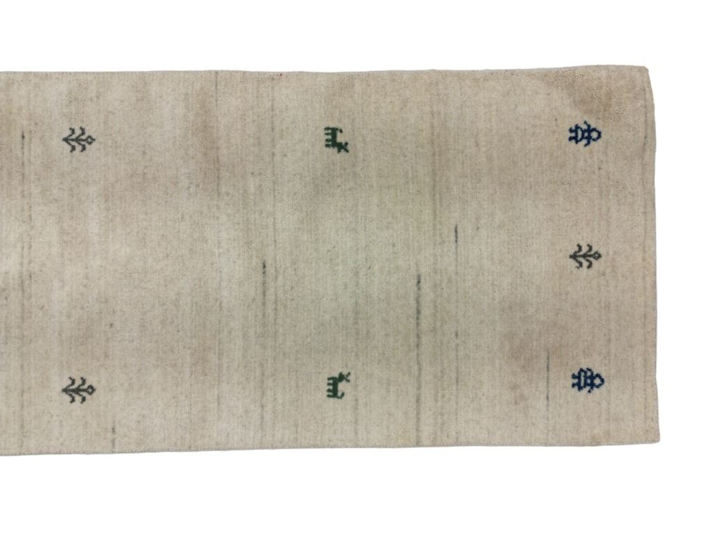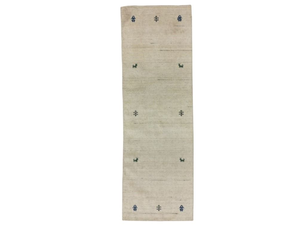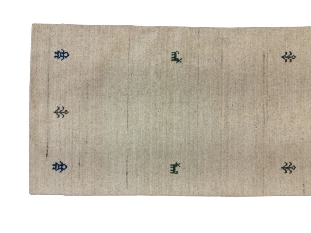 Featured in this lot is this Gabbeh Persian wool pile woven runner or rug. The circulation of Persian Gabbeh rugs from Iran into the Western market is relatively new. These rugs were being woven in Persia in the 1500's but were unheard of until fifty years ago. The rug features a wonderfully and professionally crafted wool construction that shows a pile woven design with figures decorating in colors of blue and grey set to a beige field. The condition of this Gabbeh runner or rug is well preserved with no obvious signs of damage and shows a well preserved overall condition. The measurements of this Gabbeh rug is 7.1' x 2.6'. The collective weight of this rug is 10lb 14oz.. S854