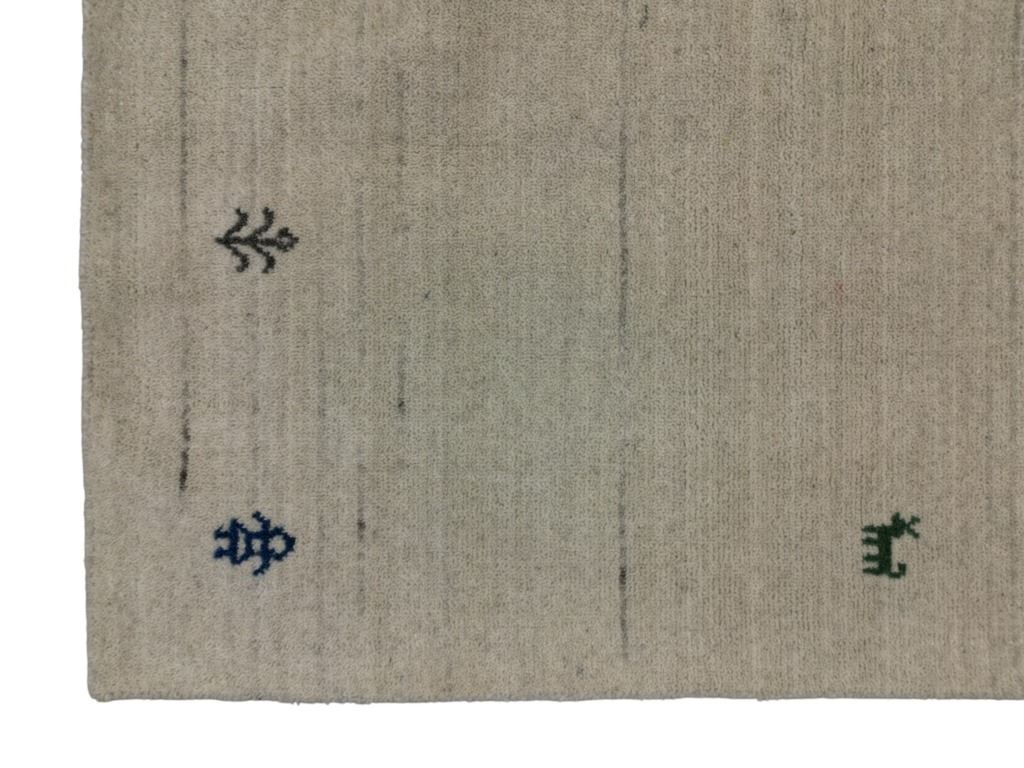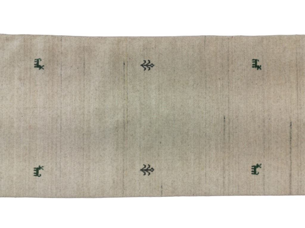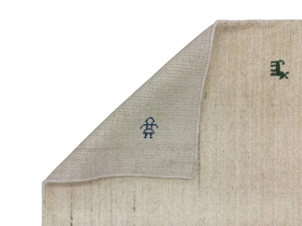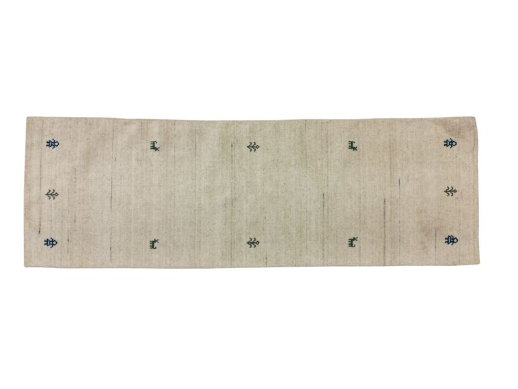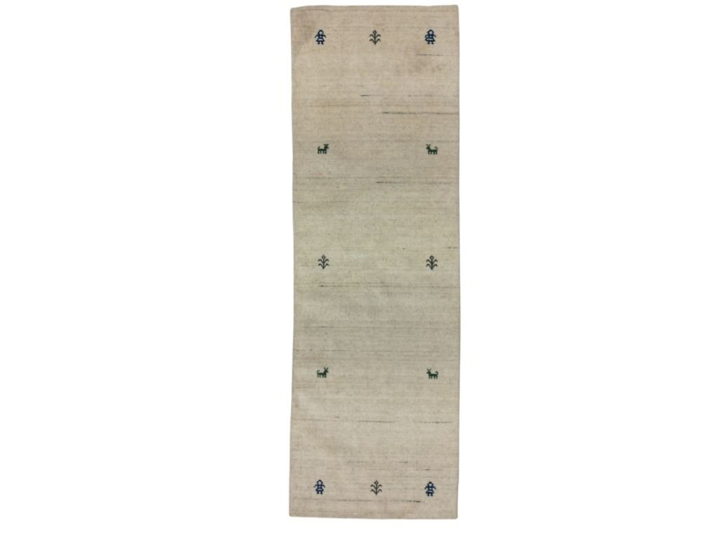 Featured in this lot is this Gabbeh Persian wool pile woven runner or rug. The circulation of Persian Gabbeh rugs from Iran into the Western market is relatively new. These rugs were being woven in Persia in the 1500's but were unheard of until fifty years ago. The rug features a wonderfully and professionally crafted wool construction that shows a pile woven design with figures decorating in colors of blue and grey set to a beige field. The condition of this Gabbeh runner or rug is well preserved with no obvious signs of damage and shows a well preserved overall condition. The measurements of this Gabbeh rug is 7.1' x 2.6'. The collective weight of this rug is 10lb 14oz.. S854