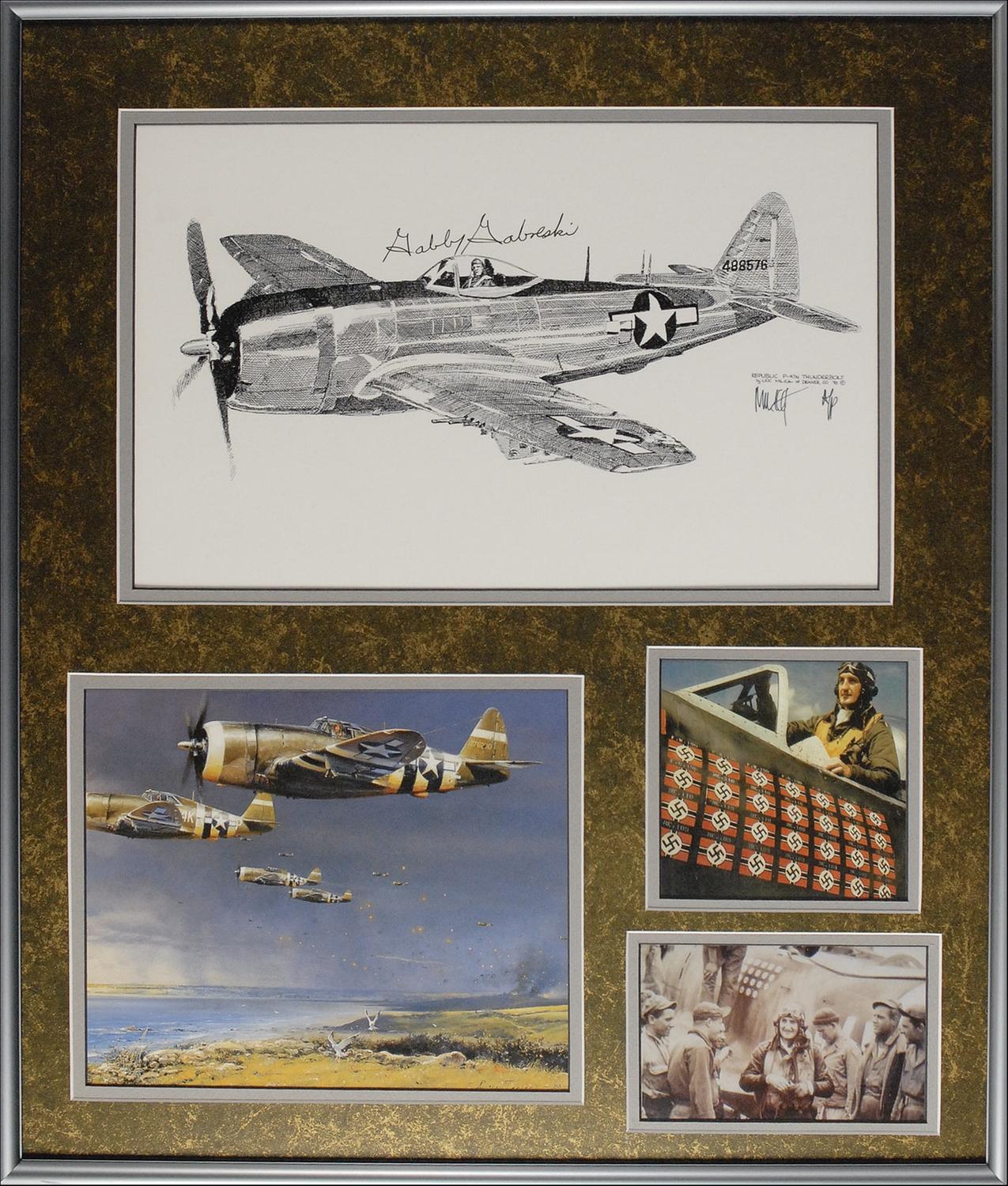 Top American fighter ace during World War II in Europe, credited with 28 victories in the P-47 Thunderbolt. Limited edition 17 x 11 print of a Republic P-47D Thunderbolt, numbered AP, signed in black felt tip by the top American fighter ace of World War II Europe. Also signed in black felt tip by the artist, Joe Milich. Double matted and framed with three photos, to an overall size of 22 x 26. In fine condition. Oversized