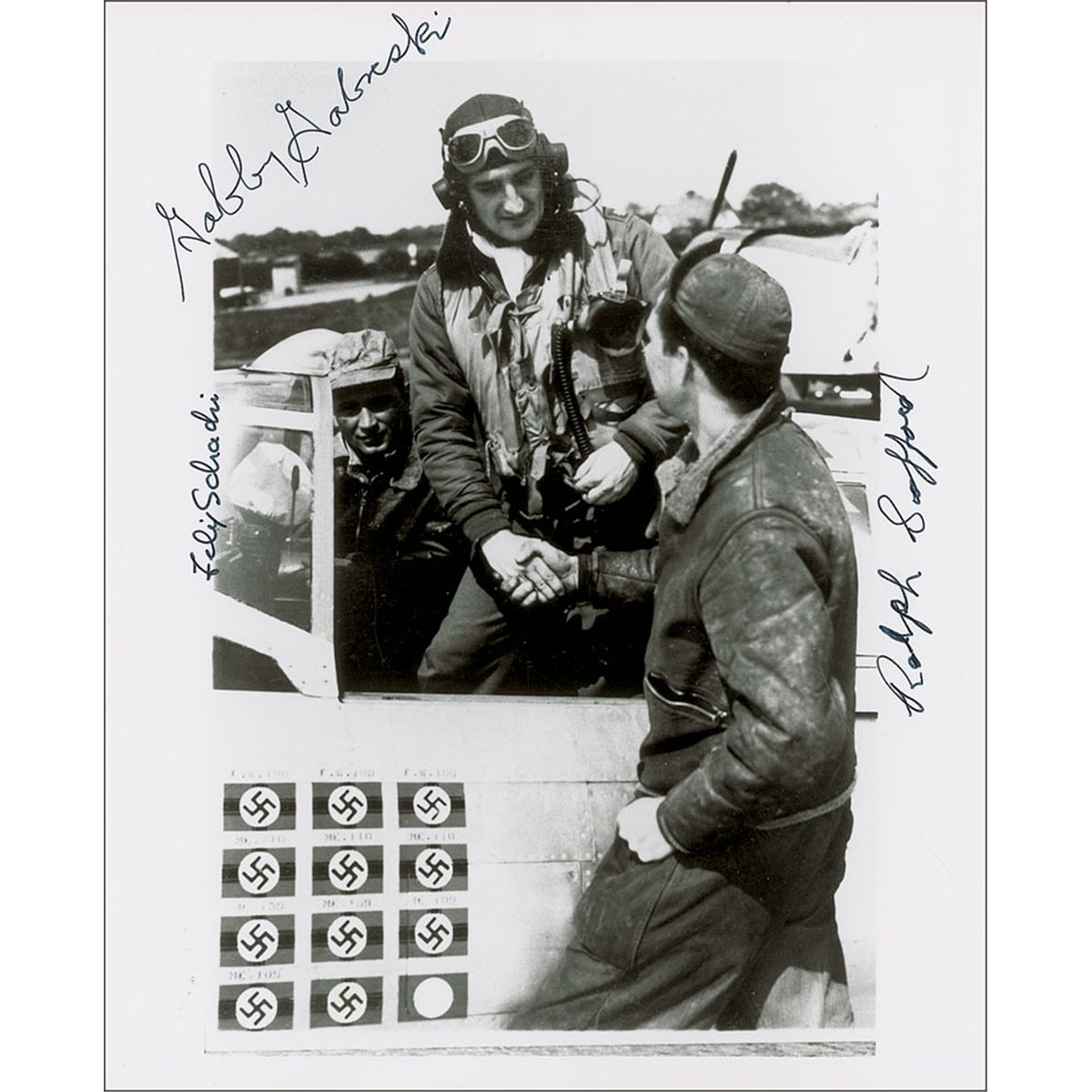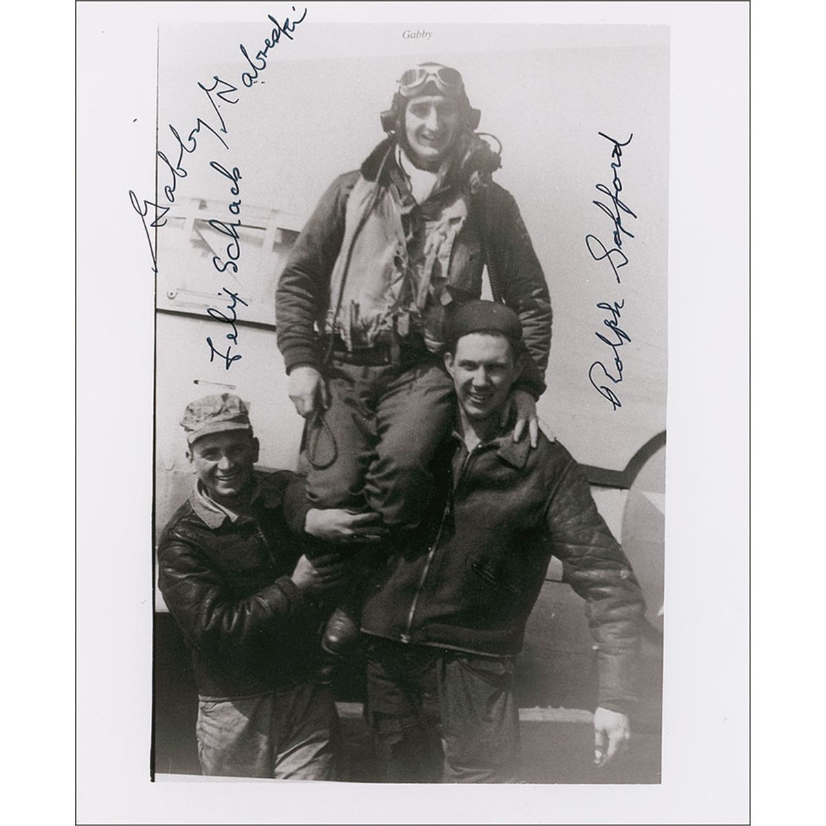 Two different glossy 8 x 10 photos featuring Gabreski and his crew, signed in black felt tip by Gabreski Crew Chief, Ralph Safford (vertically), and Assistant Crew Chief Felix Schacki (vertically). In very fine condition.