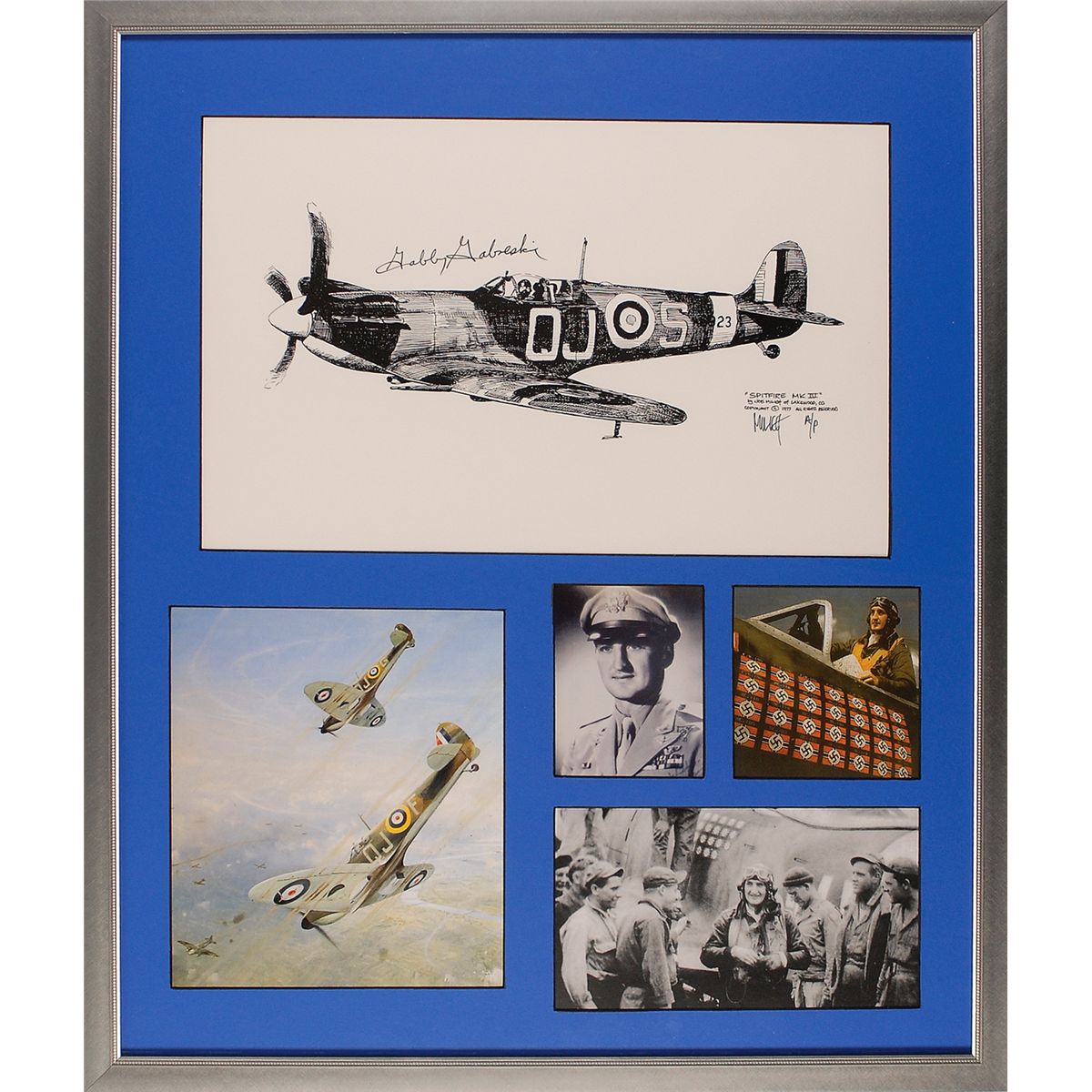 Limited edition 17 x 11 artist’s proof print of a Spitfire MK III, signed in black felt tip by Gabreski. Also signed in felt tip by the artist, Joe Milich. Matted and framed with four photos to an overall size of 22.5 x 26.5. In fine condition. Oversized.
