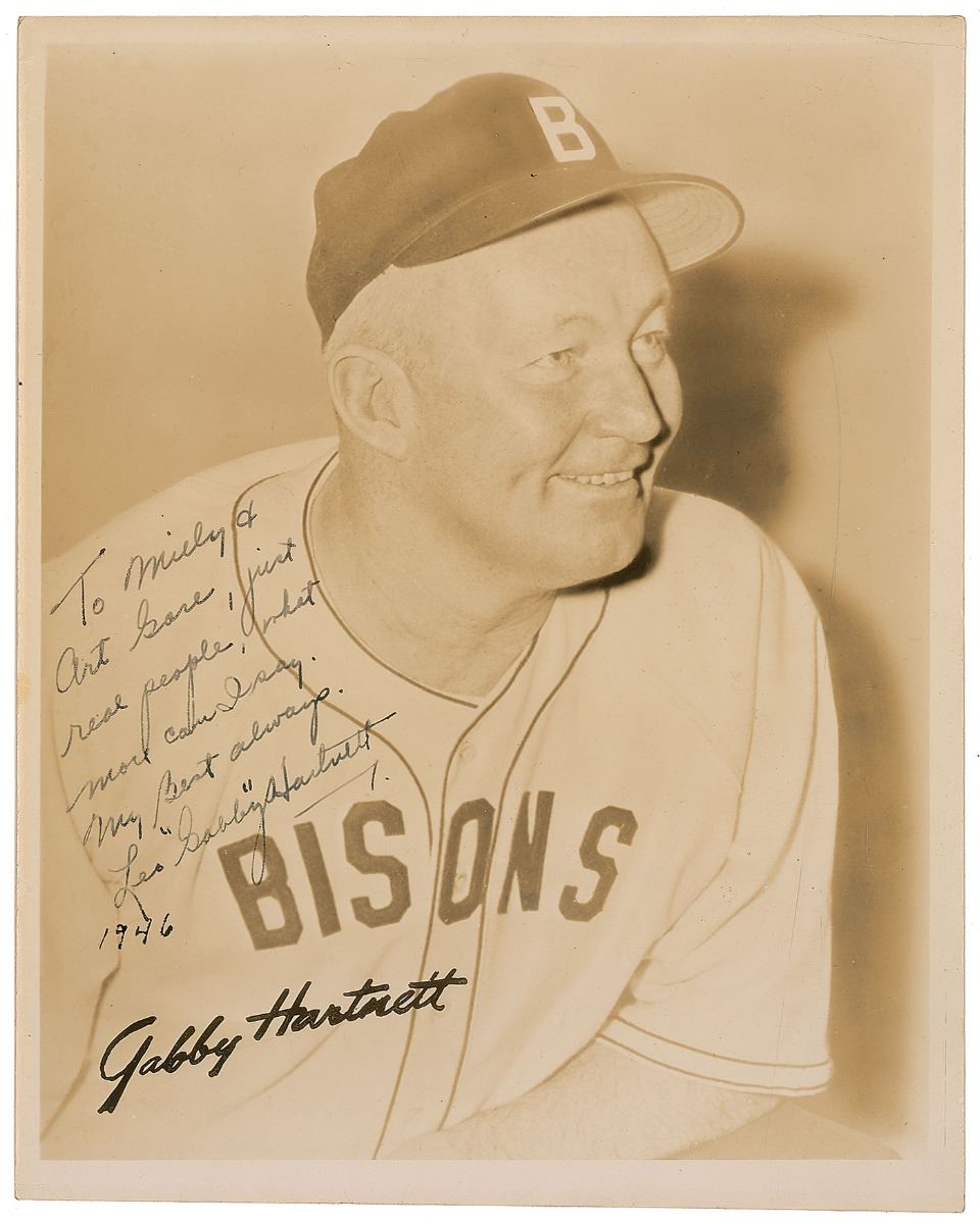 Vintage glossy 8 x 10 photo of Hartnett as manager of the Buffalo Bisons, signed and inscribed in fountain pen, “To Milly & Art Gore, just real people, what more can I say. My best always, Leo ‘Gabby’ Hartnett,” with the date, “1946,” added below in another hand. In fine condition, with scattered creases. Gore served as a National League umpire from 1947 to 1956, officiating two World Series and two All-Star Games.