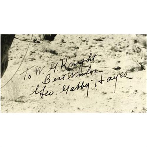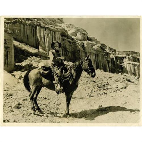 <B>Gabby Hayes Signed Photo.</B></I> A b&w 11" x 14" photo of Hayes atop a horse, inscribed and signed by the great character actor in black ink. In Very Fine condition with some wear and staple holes tot he corners. <I>Accompanied by LOA from PSA/DNA.</B></I><BR><BR><b>Shipping:</b> Flat Material, Small (<a target="_blank" href="http://www.heritageauctions.com/common/shipping.php">view shipping information</a>)