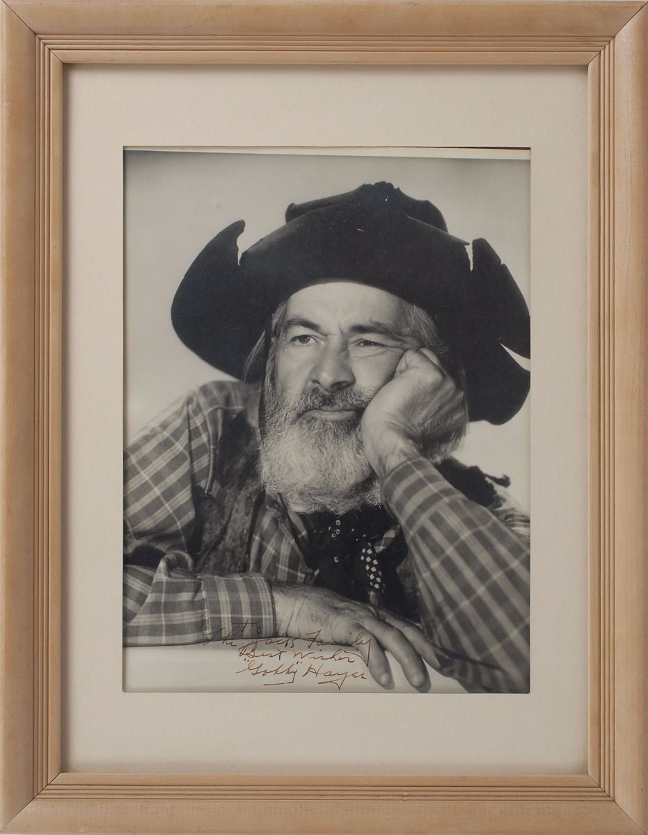 Vintage matte-finish 9 x 12 photo of Hayes in Western attire, looking rather indifferent, signed and inscribed in fountain pen, “To the Jack Family, Best Wishes, ‘Gabby’ Hayes.” Framed and in fine condition. Hayes remains uncommon in photographs of such large size.