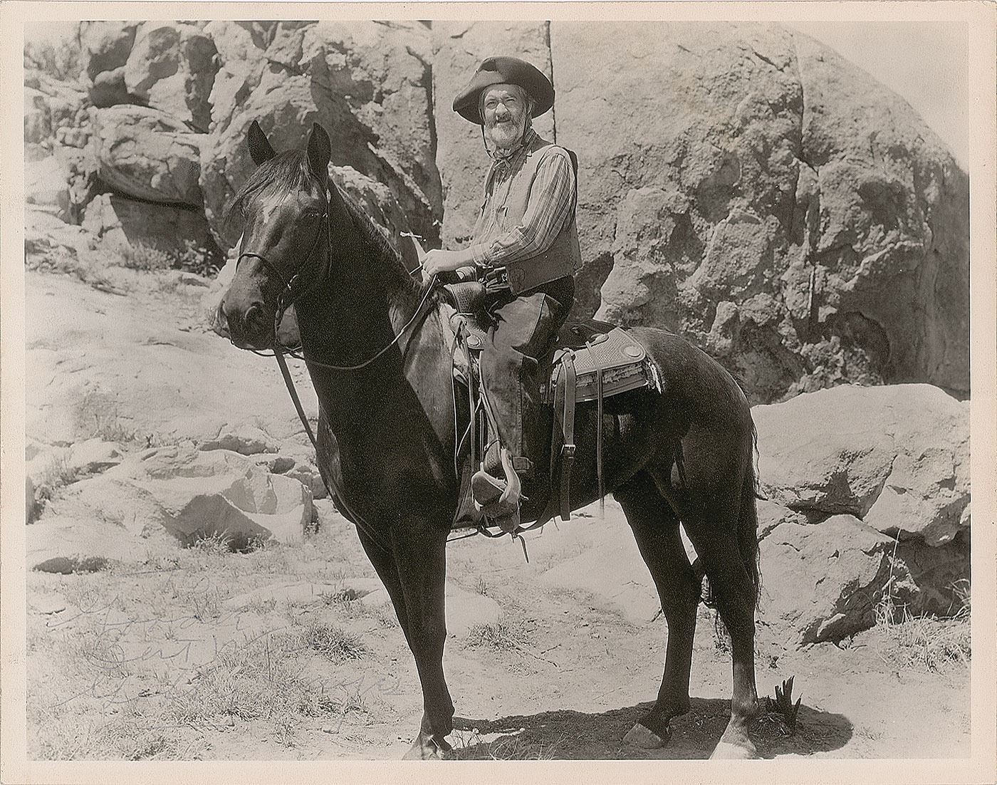 Popular American radio, film, and television actor (1885–1969) who is best remembered for his roles in Western films as the colorful sidekick to the leading man. Vintage matte-finish 10 x 8 photo of Hayes on horseback, signed and inscribed in blue ballpoint, "To Goodie, Best Wishes, Gabby Hayes.” In fine condition, with poor contrast to the very light, but readable, handwriting.