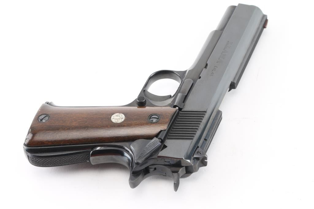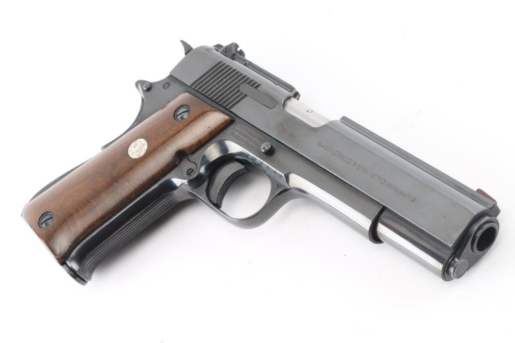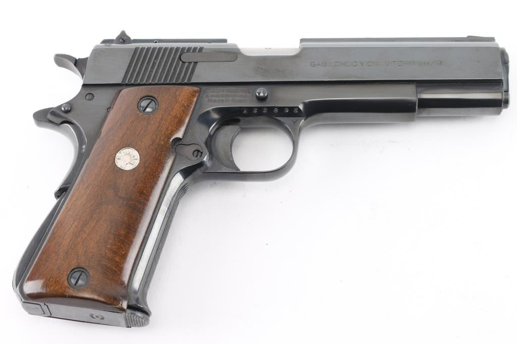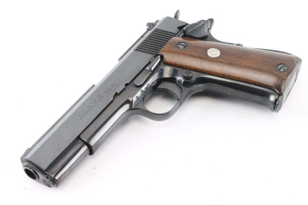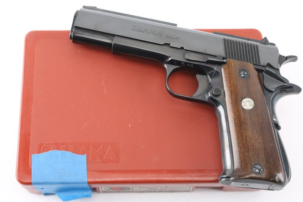SN: A33895 Spanish semiautomatic pistol imported by Stoeger Industries, S Hackensack NJ. Features blued finish, smooth wood grips with "LLAMA" logo, single action trigger, 5" barrel, fixed blade front sight, rear sight adjustable for windage, frame mounted manual safety, grip safety. Rear sight loose in dovetail. Bore is very good condition. Retains 95% finish with handling marks. Grips are very good with some rubbing on bottom edge. Includes one magazine, factory red plastic box. Condition is NRA Very Good++ *** Modern Firearm ***