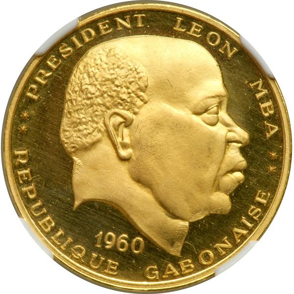 Gabon. 50 Francs, 1960. Fr-2; KM-3. Weight 0.4630 ounce. Mintage 500 pieces. On Independence. President Leon M'Ba. Reverse: Arms. NGC graded Proof 69 Ultra Cameo.