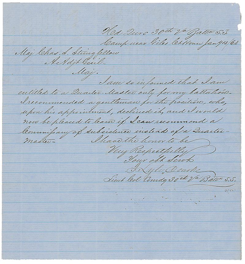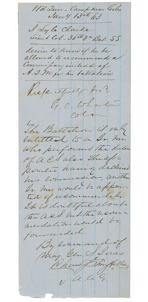 Engineer and soldier (1824-1906) who served as a general in the Confederate Army during the Civil War. War-dated handwritten endorsement, signed “G. C. Wharton, Col,” on the reverse of an LS from Lt. Colonel J. Lyle Clark of the 30th Virginia, dated January 13, 1863, to Major Charles Stringfellow. In the letter, Clark asks that in light of the fact that a potential quartermaster had declined his appointment, a commissary of subsistence be appointed in his stead. On the reverse, Wharton writes, “Respectfully for’d, G. C. Wharton Col.” Beneath Wharton’s endorsement, Stringfellow writes an endorsement on behalf of Major General Sam Jones. In fine condition, with some scattered light toning and foxing, and a few stray ink marks. An uncommon Civil War signature.