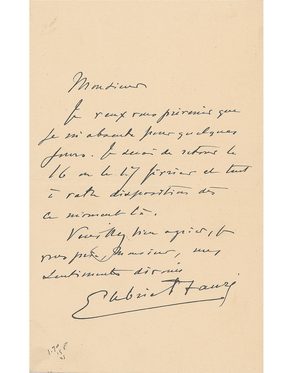 Influential French composer (1845–1924). ALS in French, one page, 4.5 x 7, no date. Untranslated letter to an unidentified gentleman. In fine condition, with a small ink notation to lower left corner.