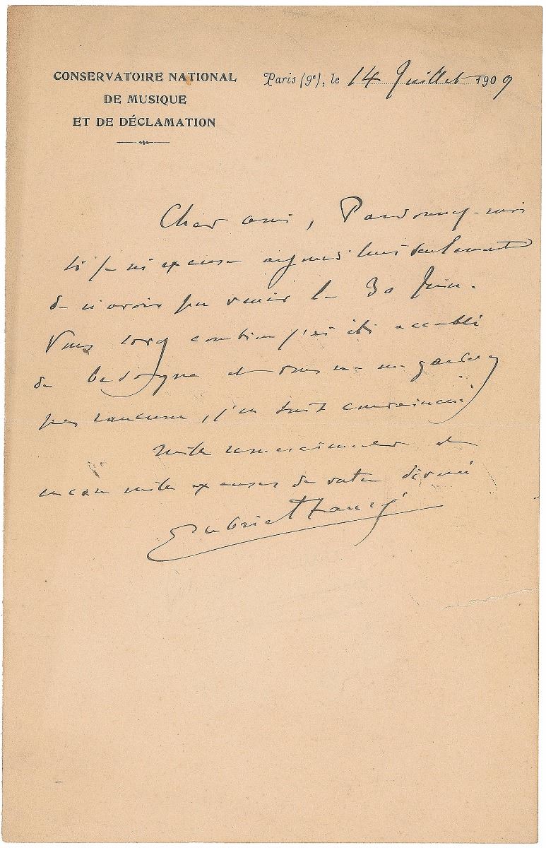 Influential French composer (1845–1924). Untranslated ALS in French, one page, 5.25 x 8.25, National Conservatory of Music and Declamation letterhead, July 14, 1909. In fine condition, with a tear to right edge.