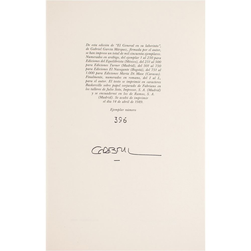 Signed Spanish-language book: El general en su laberinto (The General in His Labyrinth). Limited edition, numbered 396/1050. Madrid: Ediciones Turner, 1989. Clothbound hardcover with slipcase, 6.75 x 10.5, 284 pages. Signed on the colophon in black ink, "Gabriel." In very fine condition.