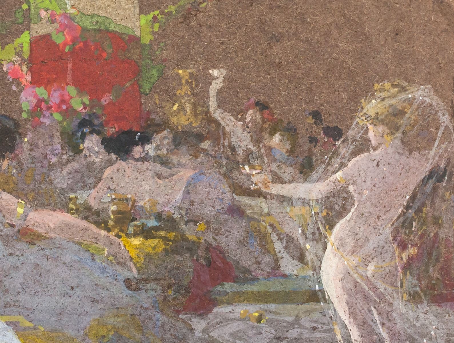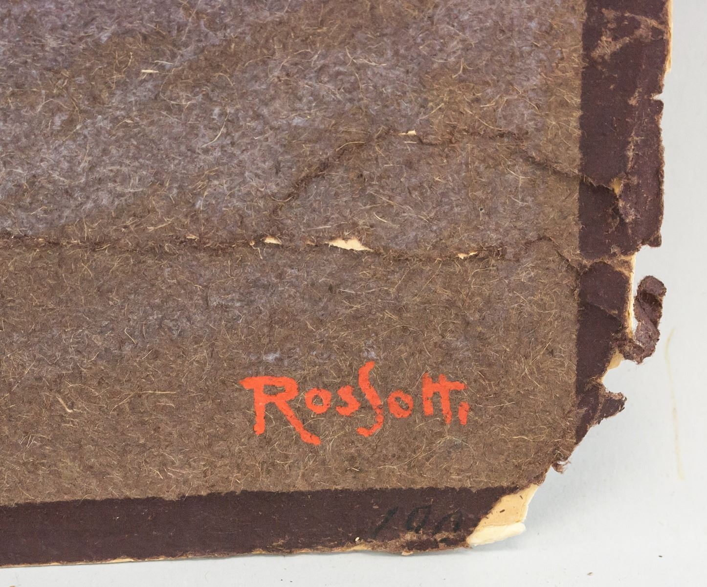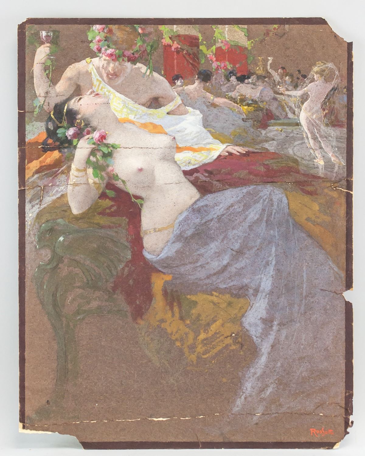 Gouache on paper. Featuring a mostly nude woman lying in the lap of a man wearing a wreath of flowers and holding a glass of wine. Signed "Rossetti" in the bottom right corner. Label affixed to verso reads "Dante Gabriel Rossetti 1828-1882". Stamped with "Galerie Beyeler PARIS" on the label. Attributed to Dante Gabriel Rossetti )1828-1882, English). Corner damage to both lower left and lower right corner. Some tears alongside edge. 69 x 54 cm (27 x 21 in). Provenance: This lot carries limited provenance from a Private British collection