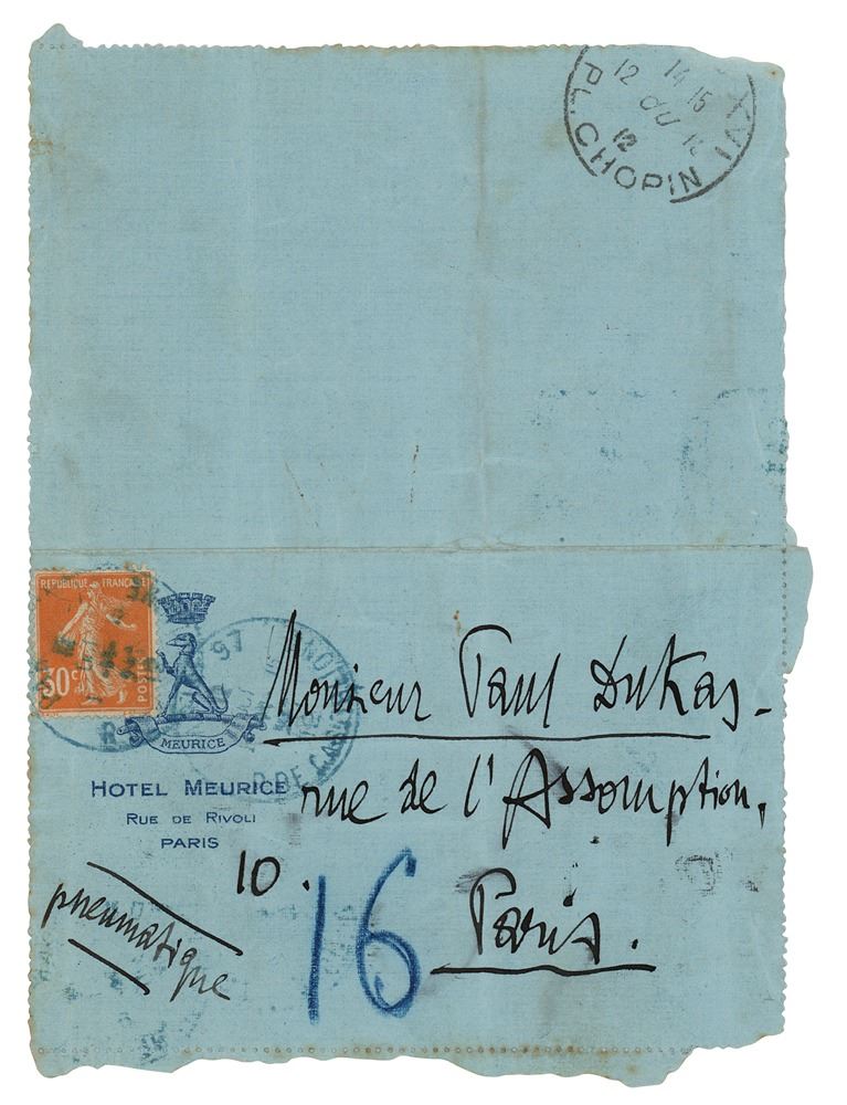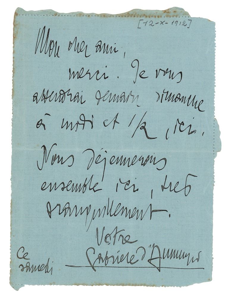 ALS in Italian, one page, 4.75 x 6.5, October 12, 1912. Untranslated handwritten letter to Paul Dukas in Paris, addressed on the reverse in D'Annunzio's own hand. In fine condition.