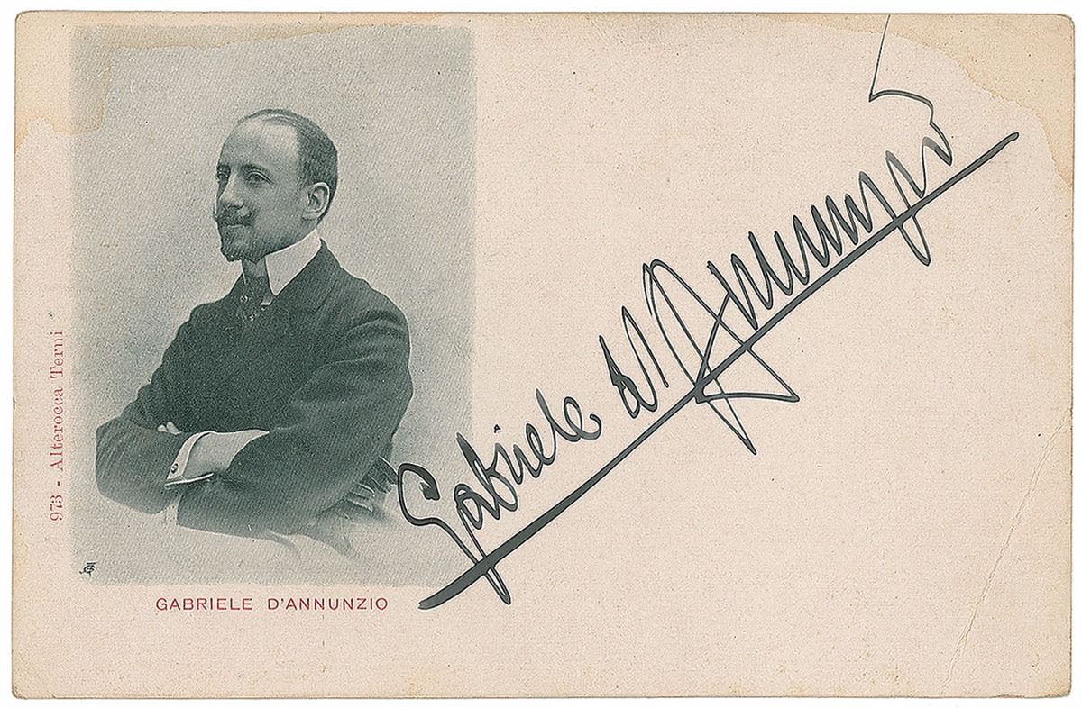 Italian poet, novelist, and dramatist (1863–1938) who distinguished himself as a heroic aviator in WWI. Appealing Italian postcard photo of D'Annunzio with his arms crossed, 5.5 x 3.5, boldly signed on the front in fountain pen. In fine condition, with light stains to top edge and a crease to lower right corner.
