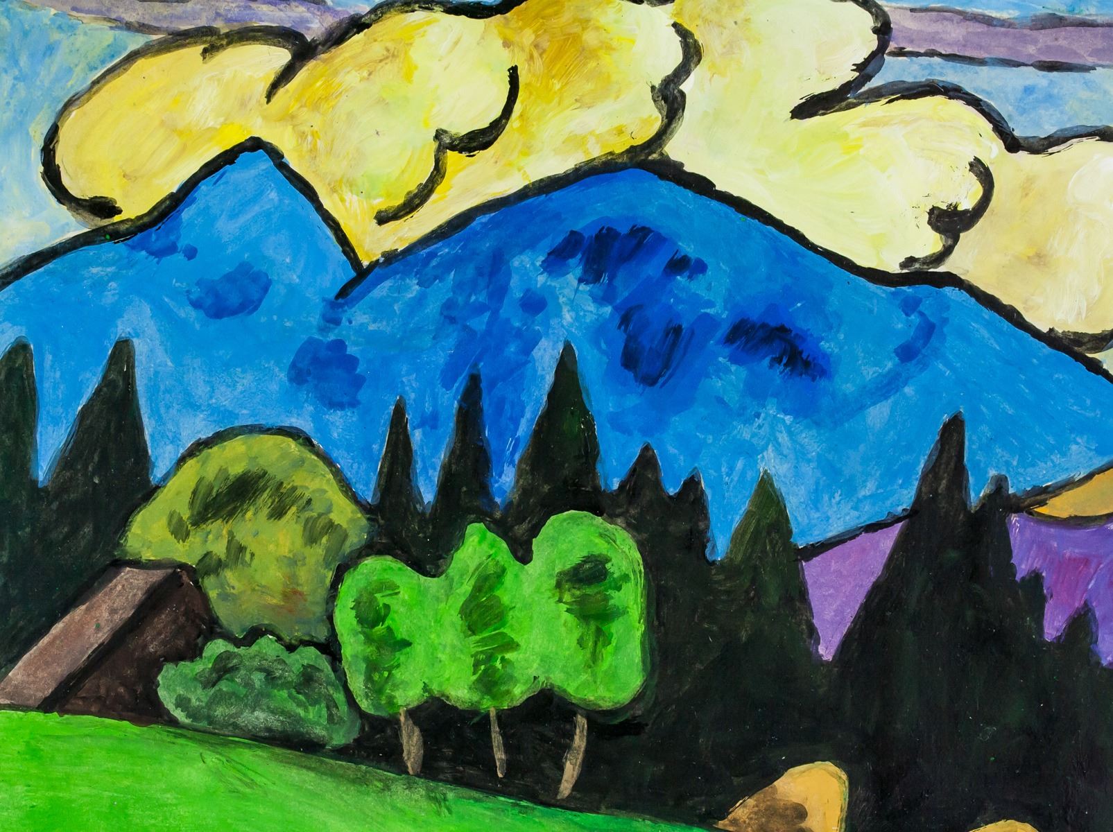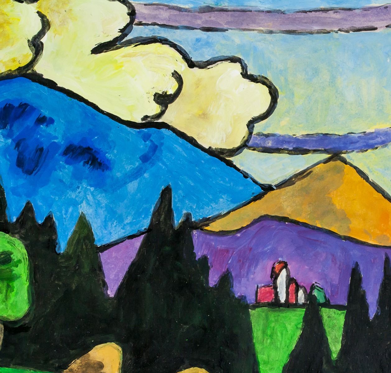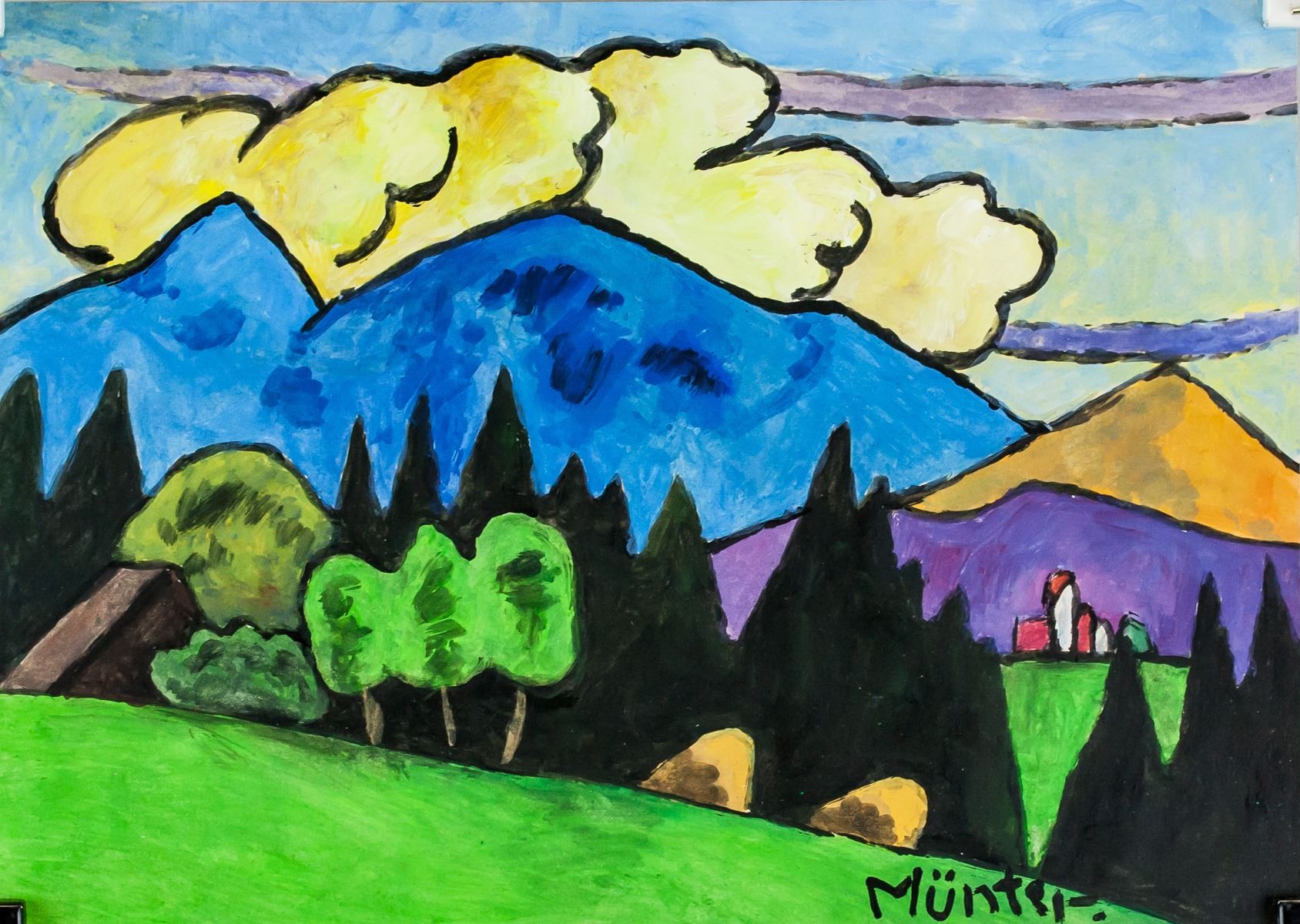Gouache on paper. Featuring a landscape scene of hillside and mountains. Signed Munter on the lower right corner. Inscribed GABRIEL MUNTER in pencil on verso. Inscribed 262 and stamped BAUHAUS KUNSTGALERIE on verso. Attributed to Gabriele Munter (1877-1962, German). 19.5 x 28 cm (7.75 x 11 in)