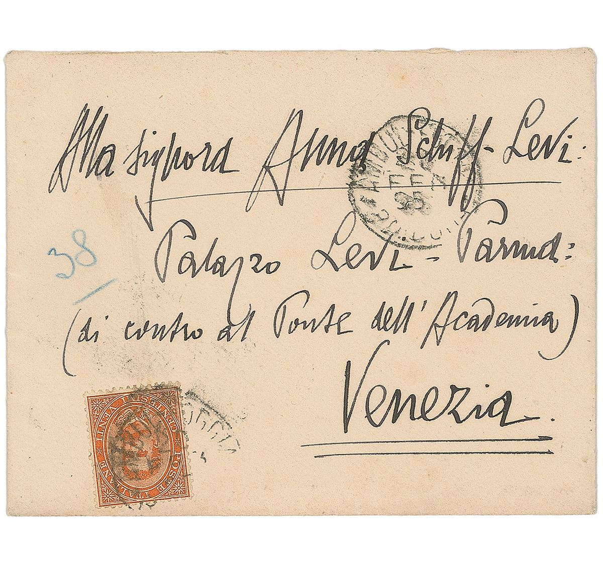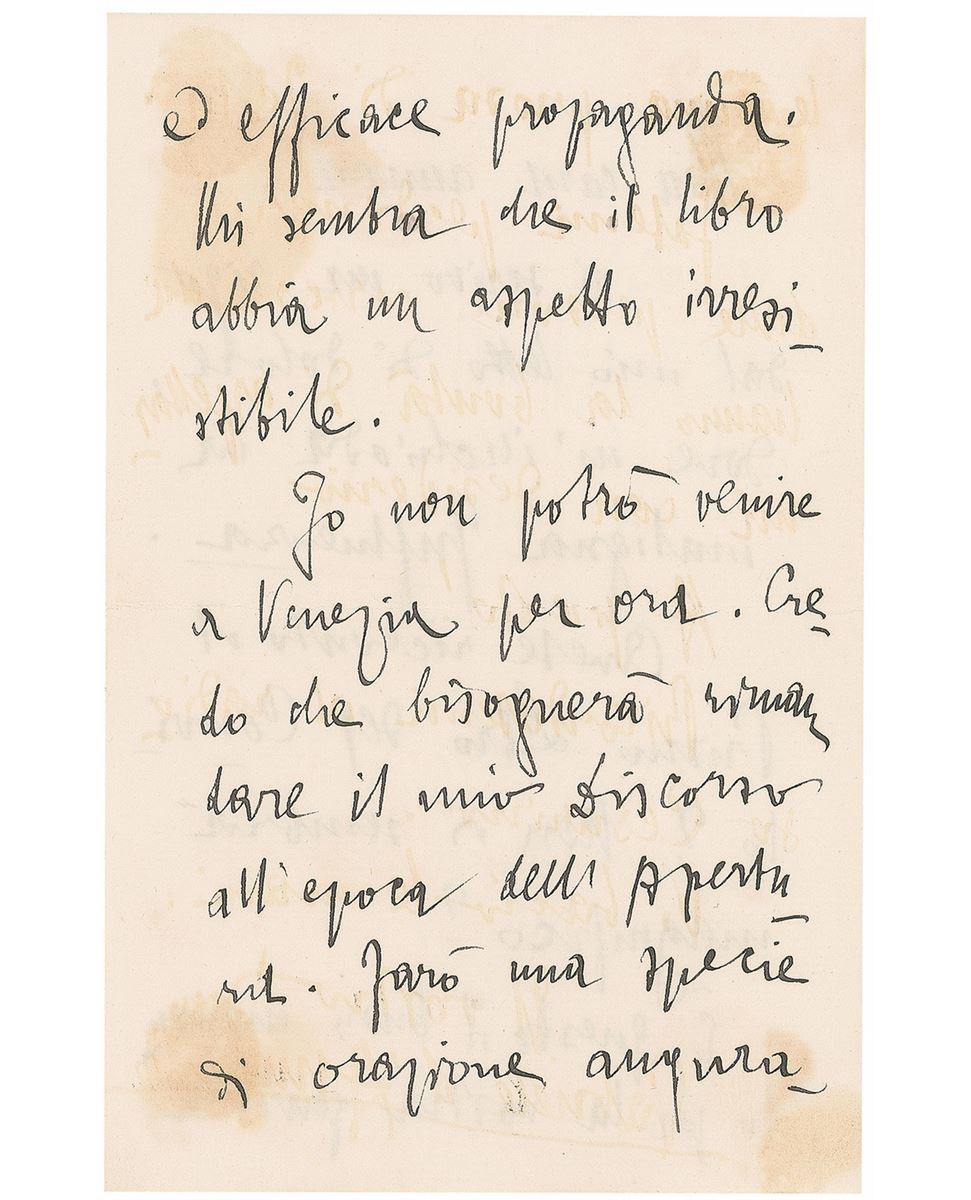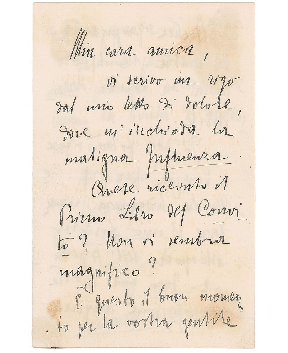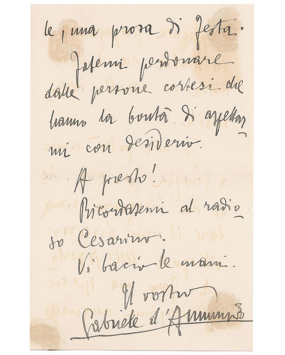 ALS in Italian, three pages on two adjoining sheets, 4.5 x 7, no date but postmarked February 20, 1895. Letter to Anna Schiff-Levi about 'Convito,' a literary and artistic magazine that d’Annunzio had recently co-founded, in part (translated): “Have you received the first book of the Convito? Does not it seem magnificent?…It seems to me that the book has an irresistible look.” Toning and show-through from wax mounting remnants to the reverse (partially affecting last name of the signature), and slight mirroring of ink, otherwise fine condition. Accompanied by the original mailing envelope, addressed in d’Annunzio’s hand. The expensively printed journal was first published in January of 1895, and remained in publication until 1907.