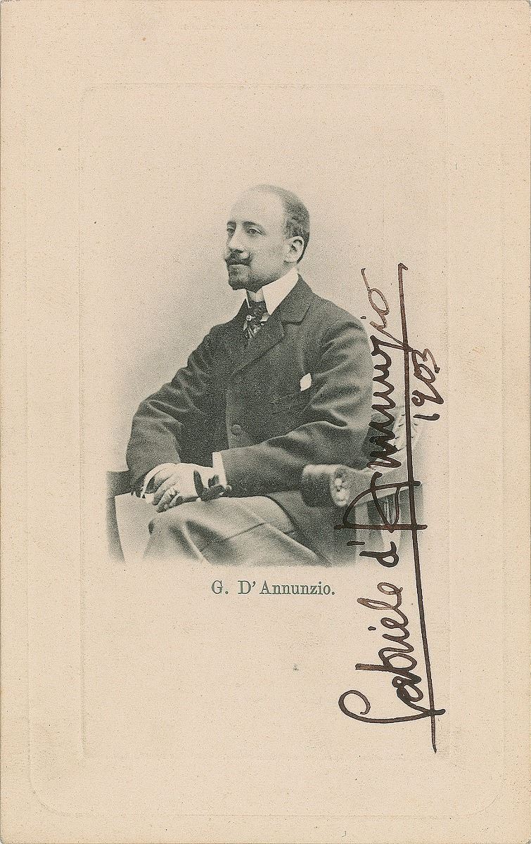 Italian poet, novelist, and dramatist (1863–1938) who distinguished himself as a heroic aviator in WWI. Appealing vintage matte-finish 3.5 x 5.5 Italian postcard photo of d’Annunzio in a dignified seated pose, vertically signed in fountain pen, “Gabriele D'Annunzio, 1903.” In fine condition.
