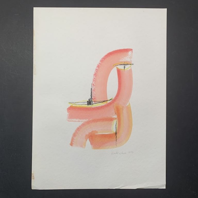 An original by Gabrielera, circa 1999, signed and dated lower right. An abstract piece done in pink, orange, yellow and black, of a design almost resembling the letters 'J' and 'F'. This piece is in very good condition with some soiling at left, crease lower right corner, and a minor crease lower left corner.