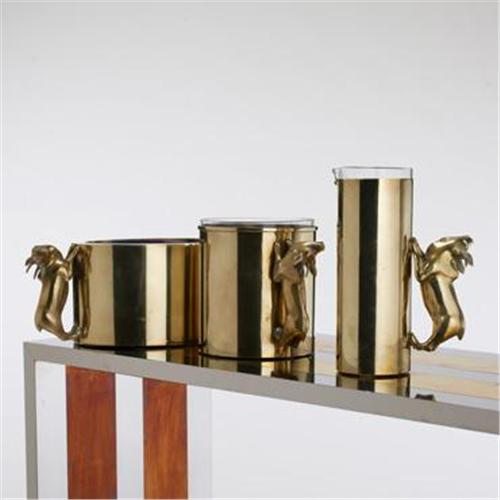 Gabriella Crespi<BR>collection of three vessels<BR>Italy, c. 1970<BR>brass, glass, glazed ceramic<BR>20 w x 10 d x 7 h inches<BR>Dimensions provided for the largest example.<BR>Impressed signature to each example: [Gabriella Crespi].<BR><BR>Condition of the item is not included in this description. Condition reports are available from Wright upon request. Wright strongly recommends that you review a condition report for each item on which you plan to bid.