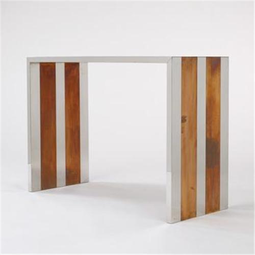 Gabriella Crespi<BR>console<BR>Italy, c. 1970<BR>stainless steel, brass<BR>43.5 w x 18 d x 31 h inches<BR>Signed with applied metal tag: [Gabriella Crespi Brev.].<BR><BR>Condition of the item is not included in this description. Condition reports are available from Wright upon request. Wright strongly recommends that you review a condition report for each item on which you plan to bid.