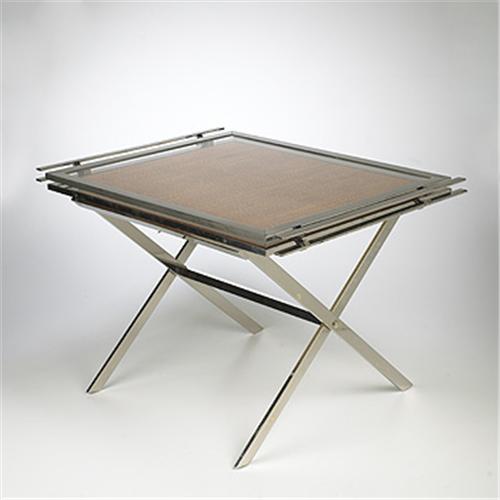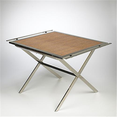 Gabriella Crespi tray table Italy, c. 1970 steel, glass, cane 34"w x 21"d x 20"h The folding base supports two trays (one shown).