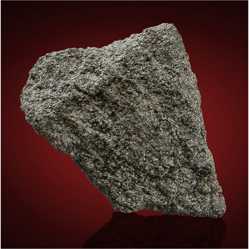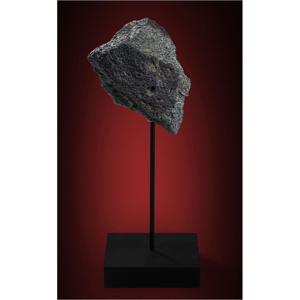 This specimen was found by desert nomads in April 2019 and is exceedingly fresh. The exterior surface is covered in fusion crust — the result of frictional heating as the meteorite burned through Earth’s atmosphere at the end of its interplanetary travels. The cut and polished face reveals a large-grained diabasic texture with clinopyroxene, lathes of maskelynite with small amounts of merrillite, apatite, ilmenite and pyrrhotite. As a result of previous research, with great confidence the presence of Martian atmosphere can be inferred in the pockets of shock melt. Accompanied by a custom armature, this is a choice specimen of the planet Mars.