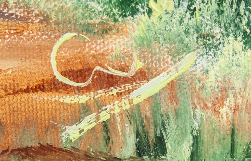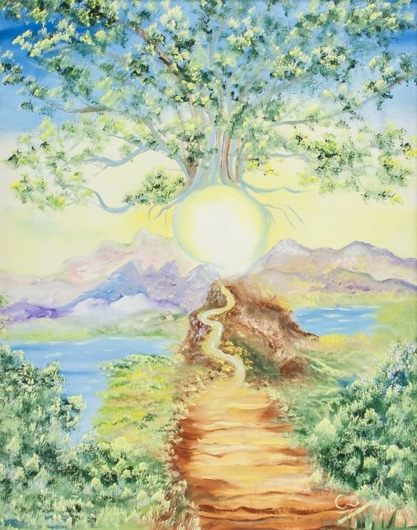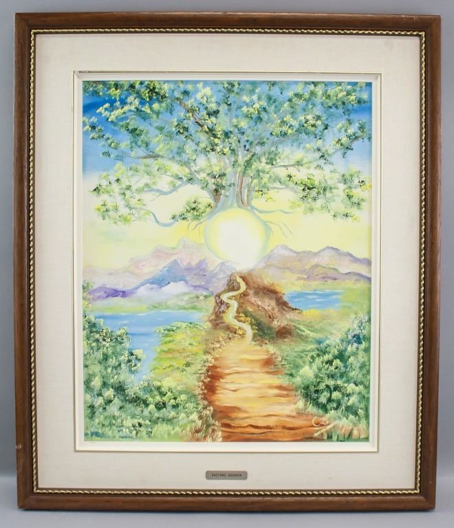 Oil on canvas, framed. Featuring mythical landscape scene with a tree sprouting from the sun. Signature in the bottom right corner. Plaque beneath image reads "GAETANE GAGNON". French inscription on verso. Attributed to Gaetane Gagnon (Canadian, b.1978). Canvas size: 49.5 x 39 cm (19.5 x 15.5 inches). Frame size: 68 x 58 cm (26.7 x 23 inches).