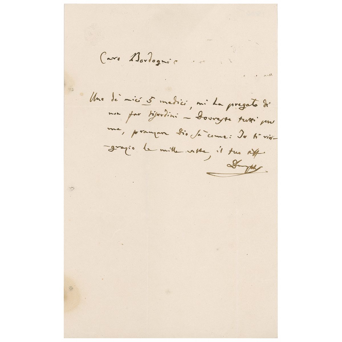 Composer (1797–1848), born in Bergamo, Italy. He studied music at Bergamo and Bologna, and produced his first opera in 1818 at Venice. The work which carried his fame beyond Italy was Anna Bolena (1830), and he had several other successes, notably Lucia di Lammermoor (1835). Stricken by paralysis, he became mentally ill. ALS in Italian, signed “Donizetti,” one page, 7 x 8, no date. Letter to his friend, tenor and singing teacher Giovanni Marco Bordogni. In full (translated): “One of my 5 doctors has asked me not to go on a fast. All of you should dine for me, God knows how. I thank you 1000 times.” In very good condition, with intersecting folds, one through a single letter of signature, a couple small binder holes, and scattered light toning and soiling.