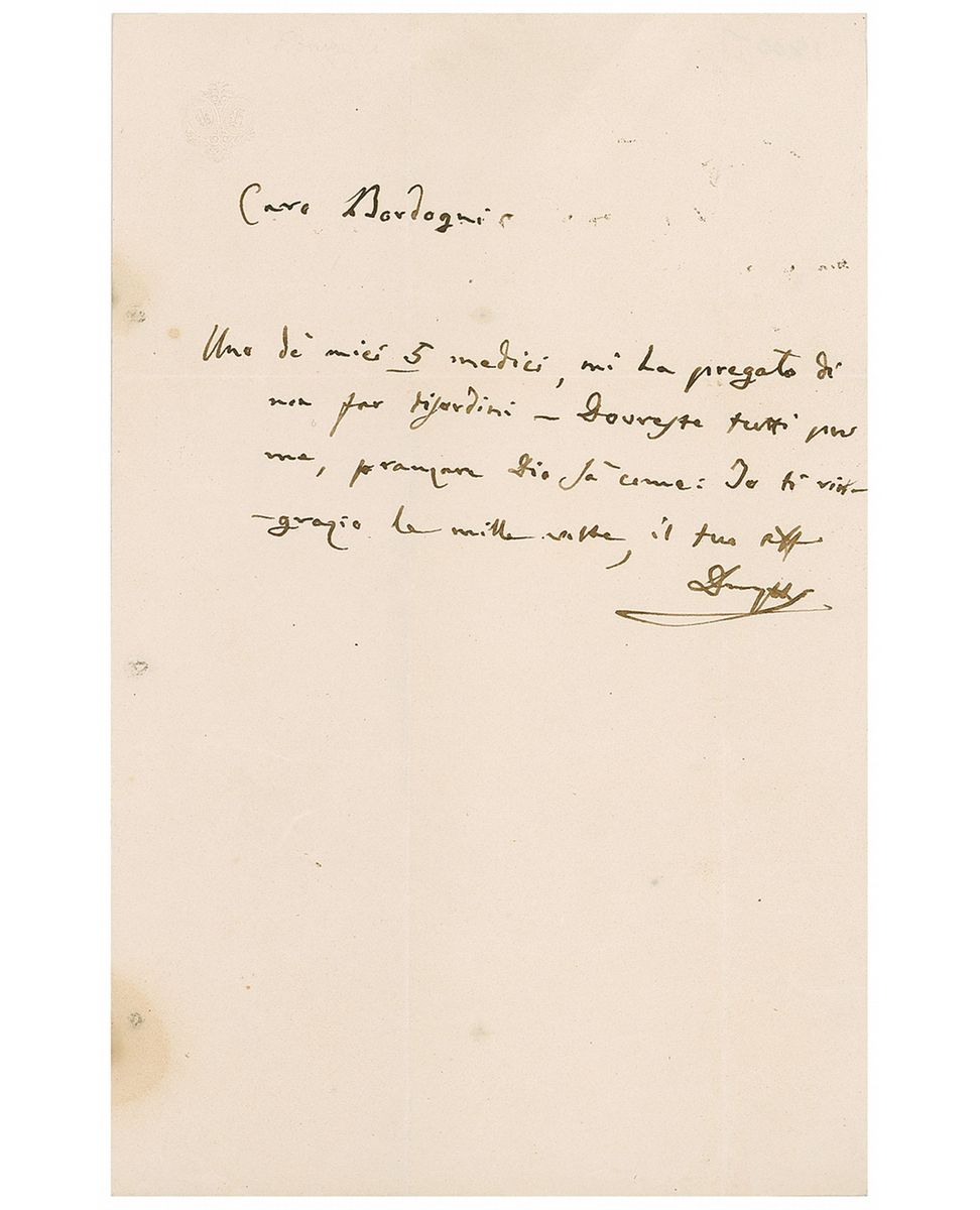 Composer (1797–1848), born in Bergamo, Italy. He studied music at Bergamo and Bologna, and produced his first opera in 1818 at Venice. The work which carried his fame beyond Italy was Anna Bolena (1830), and he had several other successes, notably Lucia di Lammermoor (1835). Stricken by paralysis, he became mentally ill. ALS in Italian, signed “Donizetti,” one page, 7 x 8, no date. Letter to his friend, tenor and singing teacher Giovanni Marco Bordogni. In full (translated): “One of my 5 doctors has asked me not to go on a fast. All of you should dine for me, God knows how. I thank you 1000 times.” In very good condition, with intersecting folds, one through a single letter of signature, a couple small binder holes, and scattered light toning and soiling.