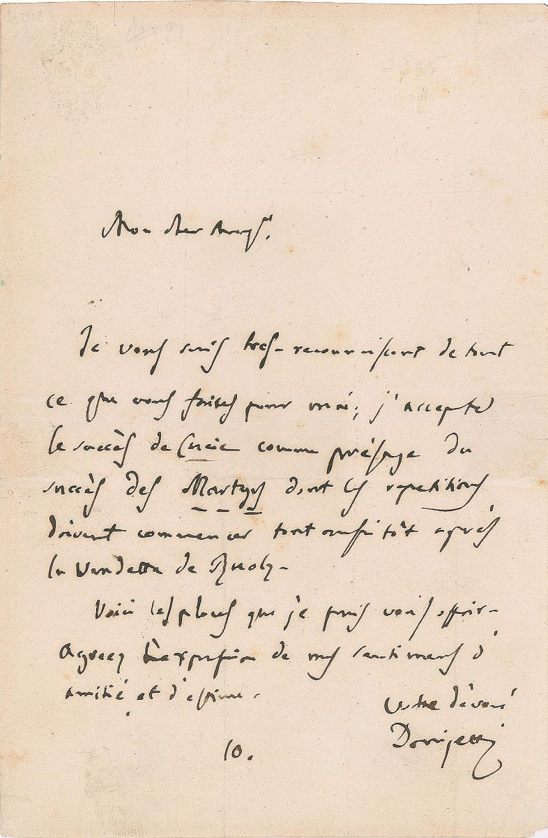 Italian composer (1797-1848) known as a leading composer of the bel canto opera style. ALS in French, signed "Donizetti," one page, 4.75 x 7.25, blindstamped monogram letterhead, no date but circa 1839-1840. Letter thanking his correspondent for his assistance, in full (translated): "I am very grateful for everything you are doing for me; I accept the success of Lucia [di Lammermoor] as an anticipation of the success of the Martyrs, that should begin rehearsing after Ruolz's Vendetta." In fine condition, with one repaired edge tear. Lucia di Lammermoor was first performed in French translation at the Theatre de la Renaissance on August 3, 1839. Donizetti was living in Paris at this time and was preparing a revision of his opera Poliuto for the Paris Opera, which premiered as Les Martyrs in April 1840.