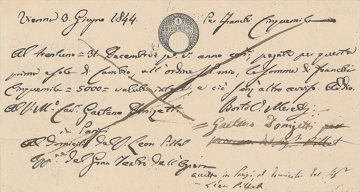 Italian composer (1797-1848) known as a leading composer of the bel canto opera style. Manuscript DS in Italian, one page, 8.25 x 4.5, June 3, 1844. Receipt penned by impresario and librettist Bartolomeo Merelli authorizing a payment of 5000 francs to Donizetti. In fine condition.