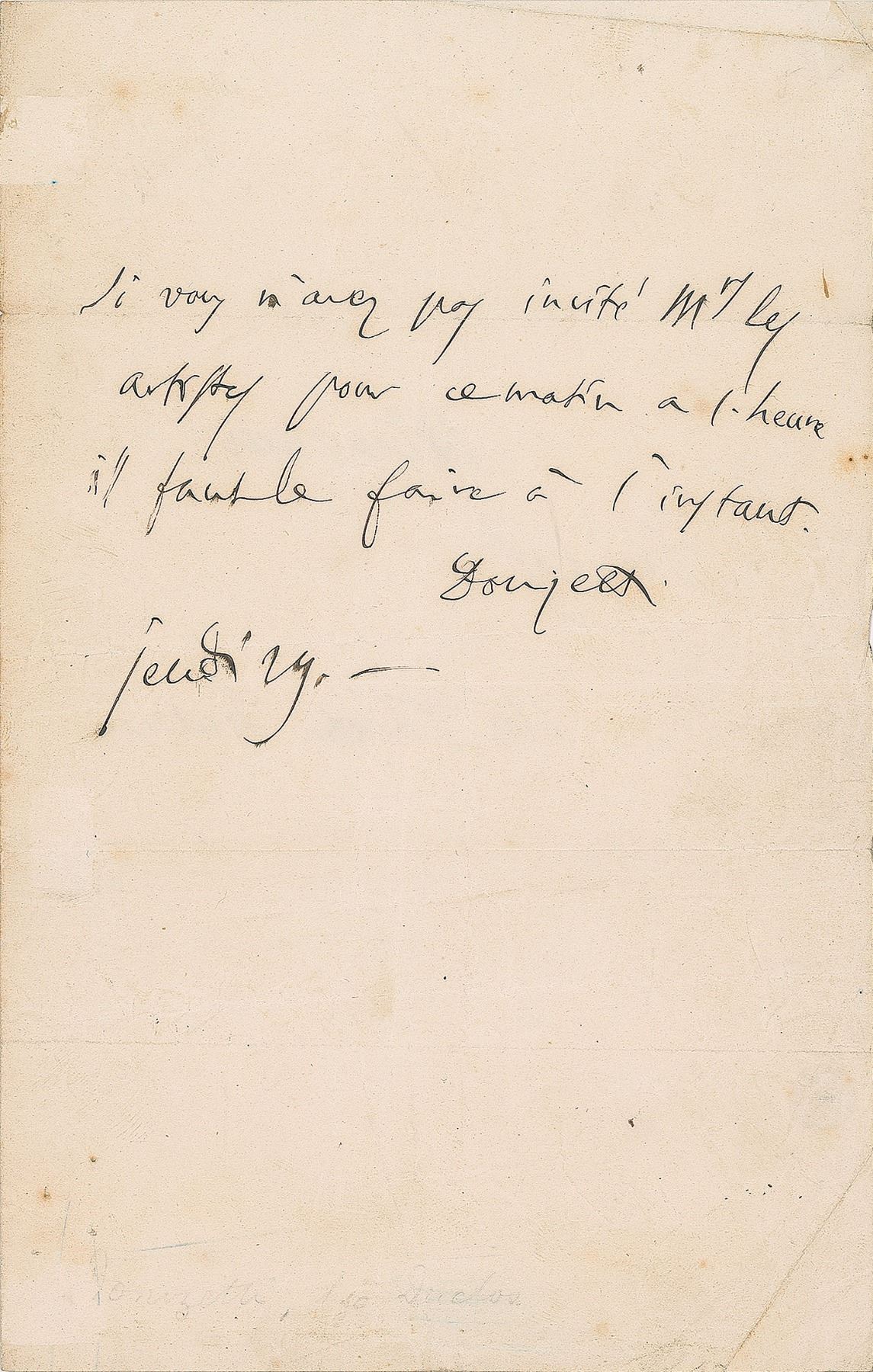 Italian composer (1797-1848) known as a leading composer of the bel canto opera style. Untranslated ALS in French, signed “Donizetti,” one page, 5.25 x 8, no date. Reverse of second integral page addressed by Donizetti. In fine condition, with scattered creasing and intersecting folds.