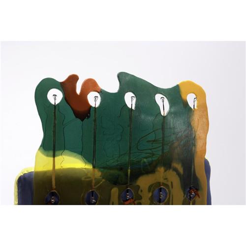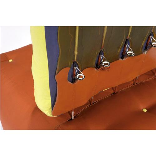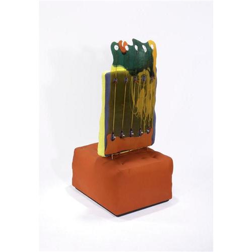 <b>Medium: </b>Multi colored resin "planks" with five semi-imbedded fishing rods on a soft cushio seat.