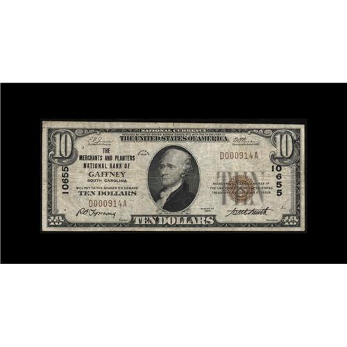 <B>Gaffney, SC</B></I> - $10 1929 Ty. 1 <B>The Merchants & Planters NB </B></I> Ch. # 10655<BR>A nice <B>Very Fine</B></I> from a community with a water tower in the shape of a giant peach, the agricultural product for which it is justifiably famous. We sold an example of this same type and denomination in VF at our 2003 FUN auction for $448.50. In a better market for difficult Nationals we expect to see that result surpassed tonight.
