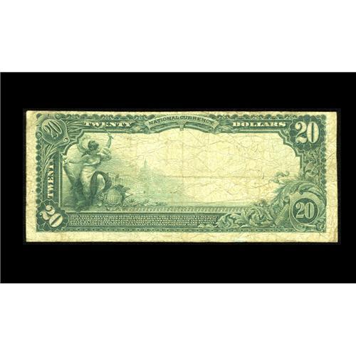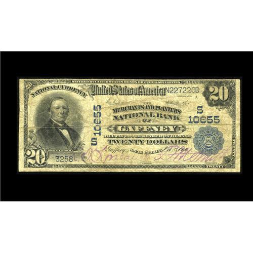 <B>Gaffney, SC</B></I> - $20 1902 Plain Back Fr. 657 <B>The Merchants & Planters NB </B></I> Ch. # (S)10655<BR>A fully margined Date Back that looks nicer than its technical grade of <B>Very Good</B></I> would imply. The officers' stamped signatures are still fully legible. This was the only one of the two issuers here to survive the Depression and today leaves a Kelly census of eight large size notes. This is an especially elusive bank and should sell for roughly...