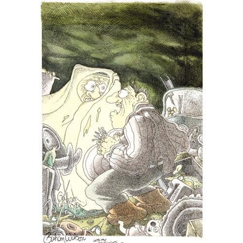 <B>Gahan Wilson - The Magazine of Fantasy and Science Fiction Cover Illustration Original Art (1980).</B></I> Gahan Wilson may be best known among science fiction fans for his long association with sci-fi/fantasy magazines, in particular, <B>The Magazine of Fantasy and Science Fiction</B></I>, where he contributed a cartoon to every issue for more than fifteen years. This wonderfully weird illustration graced the cover of the August, 1980 issue. Rendered in ink and watercolor, the image area measures 7" x 10" and the condition is Excellent. Signed and inscribed by Gahan Wilson at the bottom left.<BR><BR><b>Shipping:</b> Small Flat (<a target="_blank" href="http://www.heritageauctions.com/common/shipping.php">view shipping information</a>)
