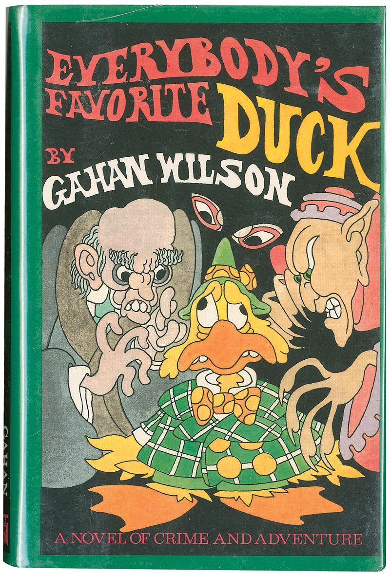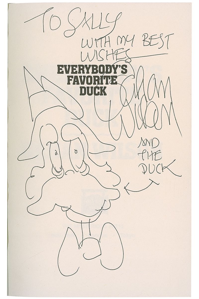 Signed book: Everybody’s Favorite Duck. First edition, later printing. NY: Mysterious Press, 1988. Hardcover with dustjacket, 5.5 x 8.5, 202 pages. Signed and inscribed on the half-title page, “To Sally, with my best wishes, Gahan Wilson and the Duck,” with Wilson adding a charming sketch of the Duck next to his signature. In fine condition, with some light wear to dustjacket.